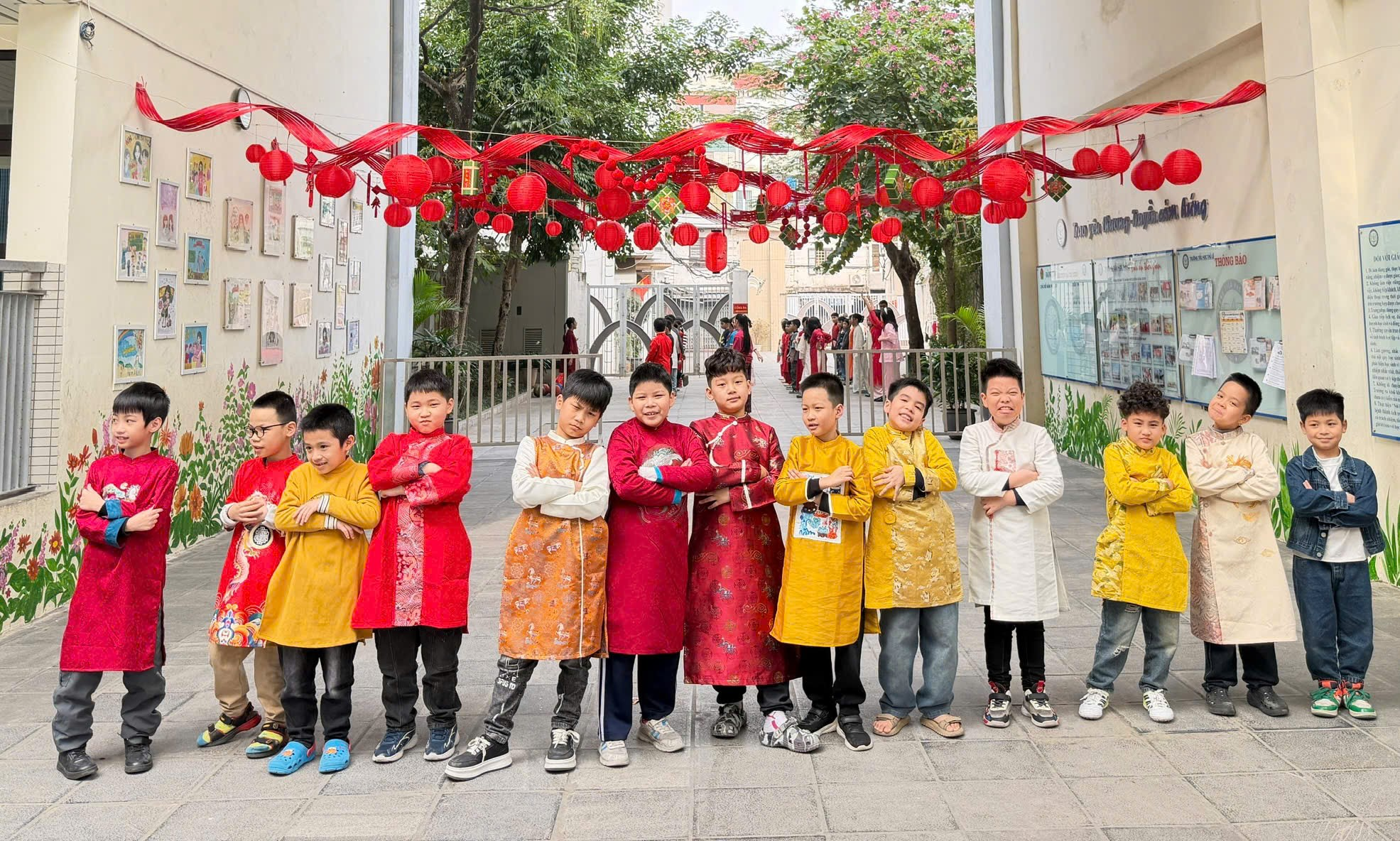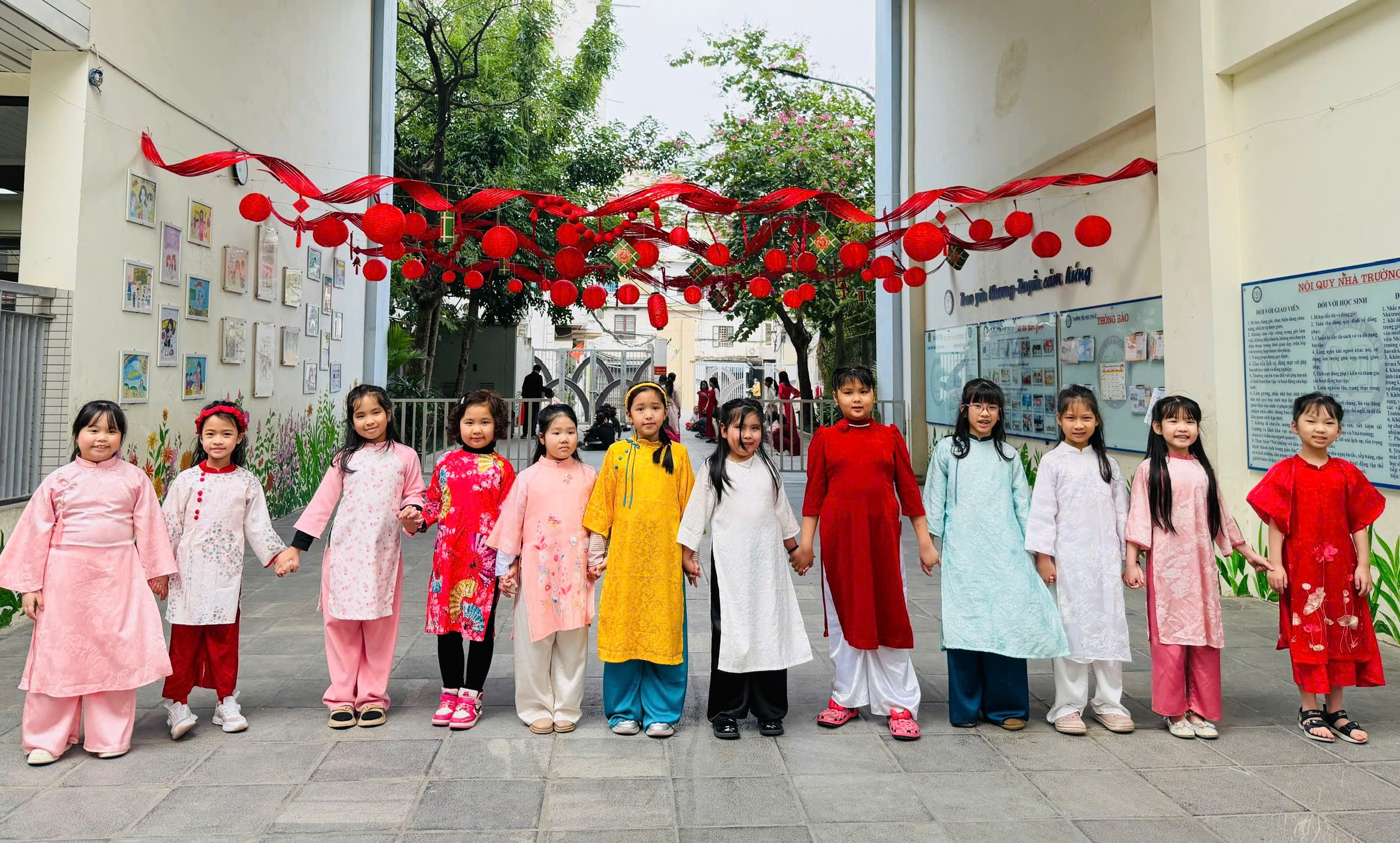 Các em học sinh lớp 3B trong tà áo dài truyền thống duyên dáng, lịch sự đã tự tin tạo dáng bên góc xuân rực rỡ. Mỗi nụ cười hồn nhiên, mỗi ánh mắt long lanh đều chứa đựng niềm háo hức chờ đón một năm mới đang về.