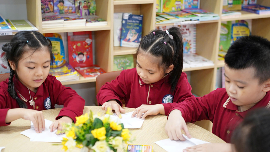 Sau phần sân khấu hóa, học sinh được tham gia tự tay làm tranh, đạo cụ và nhân vật kịch giấy. Hoạt động này giúp các em thỏa sức sáng tạo, phát huy óc quan sát, khả năng khéo léo, đồng thời hiểu hơn về quá trình hình thành một vở kịch – từ ý tưởng, tạo hình nhân vật đến biểu diễn.