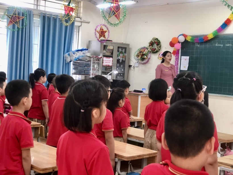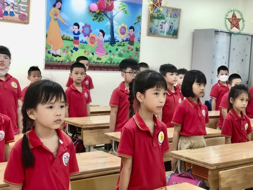 Học sinh khối 1 trang nghiêm trong lễ chào cờ đầu tuần.