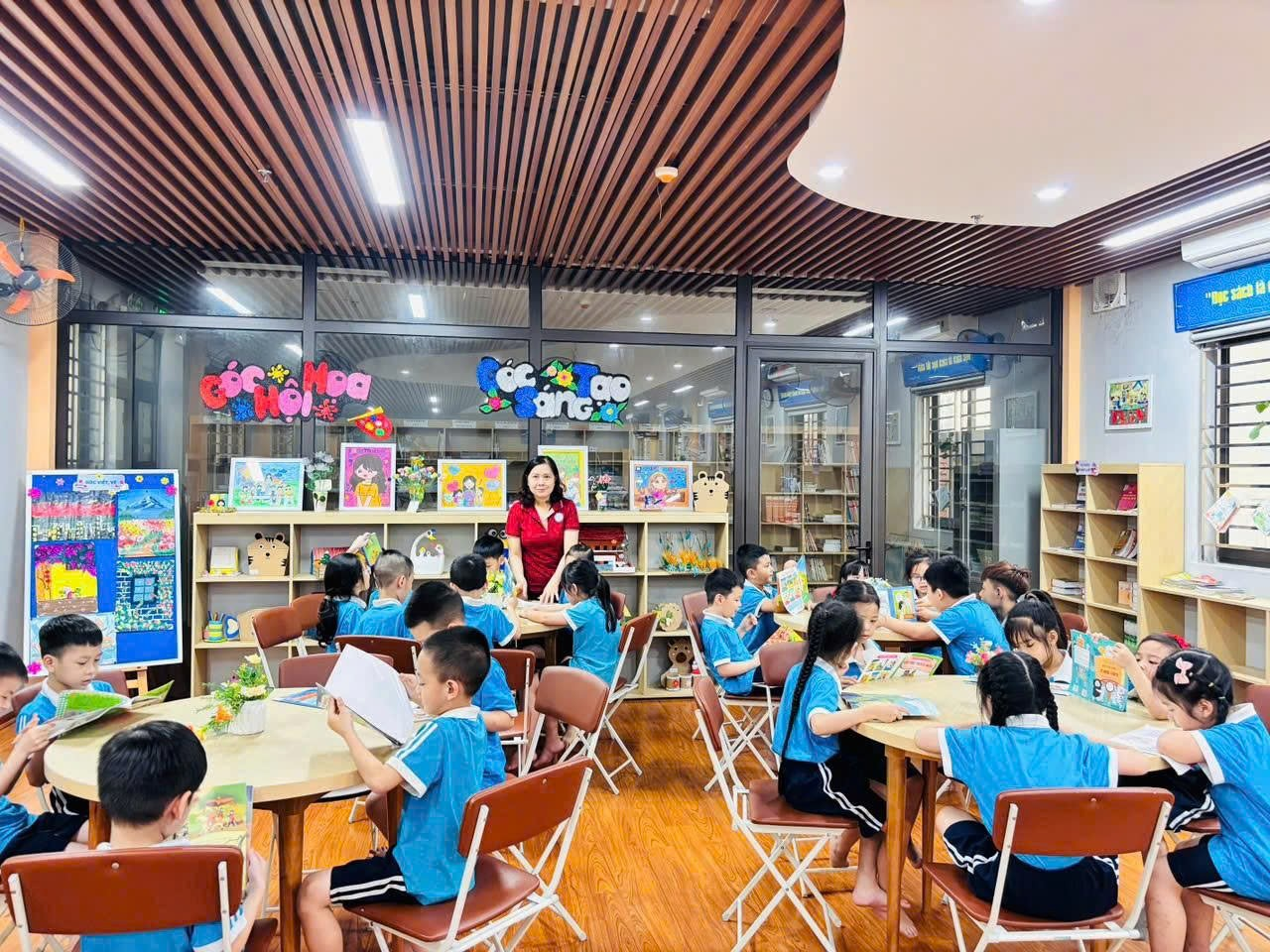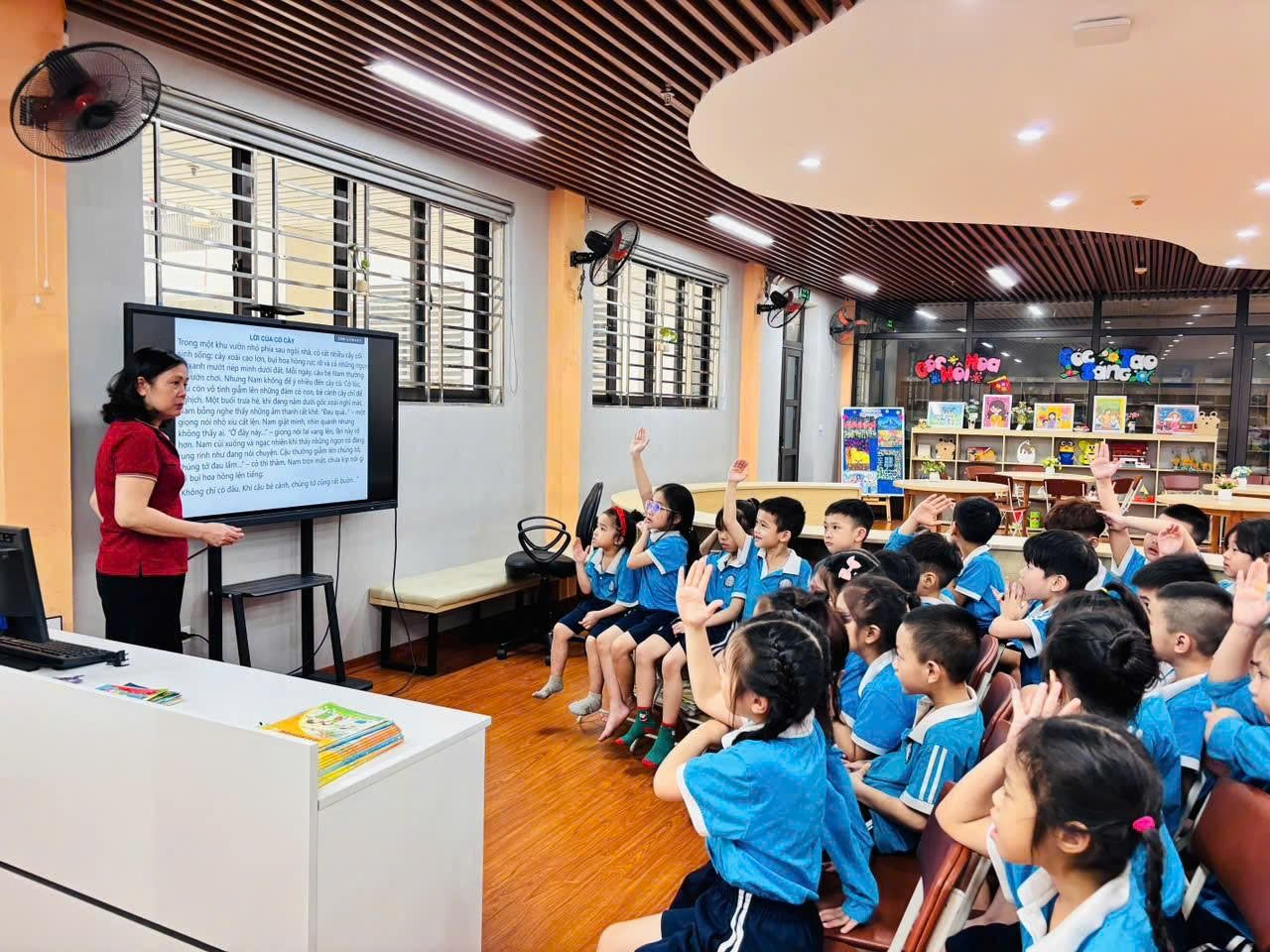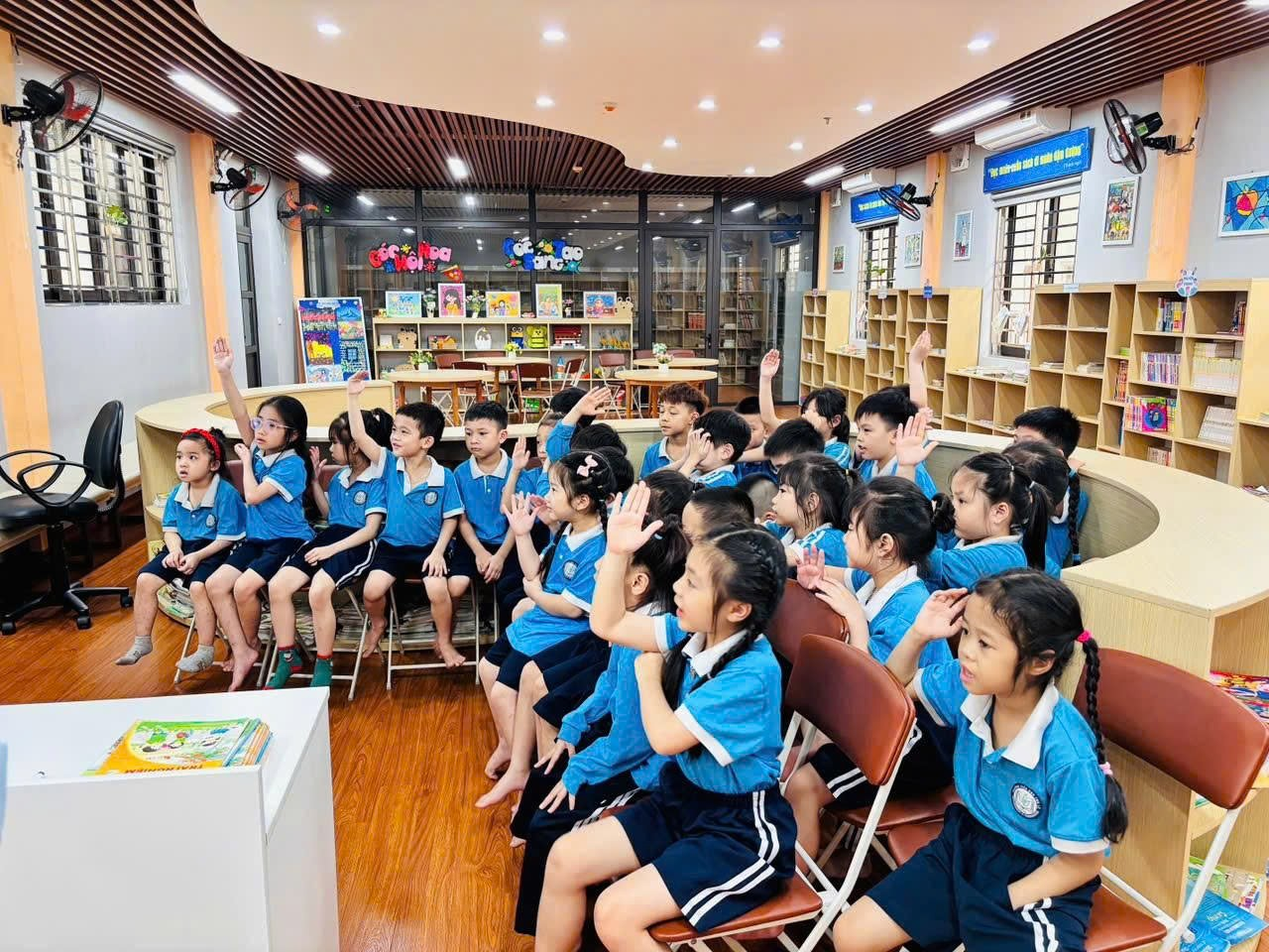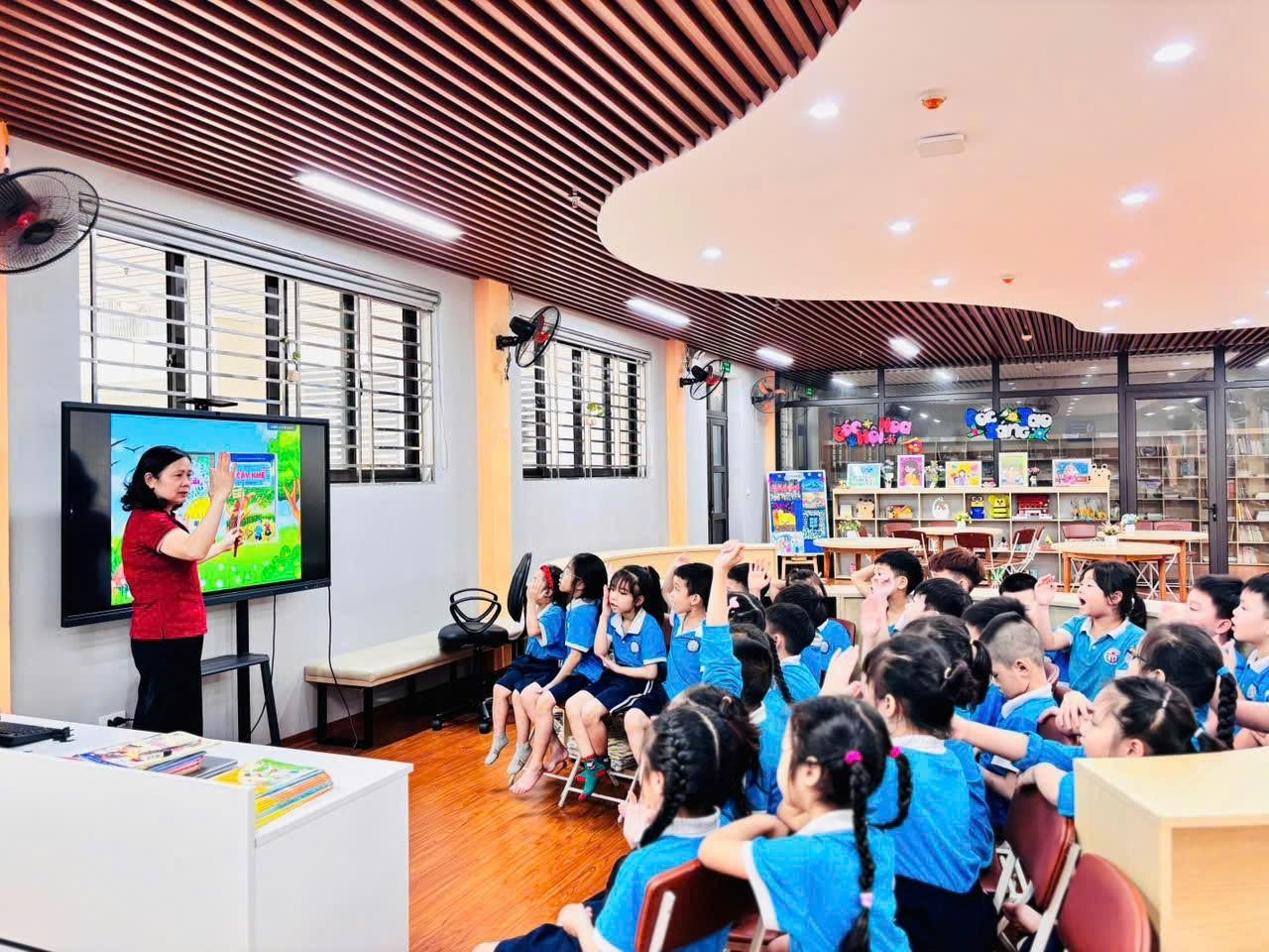Tiếp đó, các em cùng nhau đọc sách, nghe kể chuyện và chia sẻ những điều mình cảm nhận; có bạn tưởng tượng cây đang vẫy tay chào, có bạn lại nghe thấy tiếng thì thầm của những chiếc lá, những cánh tay nhỏ xinh liên tục giơ lên mang theo biết bao suy nghĩ ngây thơ và đáng yêu, làm cho không khí lớp học trở nên rộn ràng, vui tươi. Thông qua các hoạt động nhẹ nhàng và gần gũi ấy, các em dần hiểu rằng thiên nhiên cũng là người bạn thân thiết quanh mình, từ đó biết yêu quý, chăm sóc cây cối và thêm hứng thú với việc đọc sách mỗi ngày, để mỗi trang sách mở ra không chỉ là câu chuyện mà còn là một thế giới nhỏ nuôi dưỡng những tình cảm đẹp đẽ, trong trẻo trong tâm hồn các em. 🌱