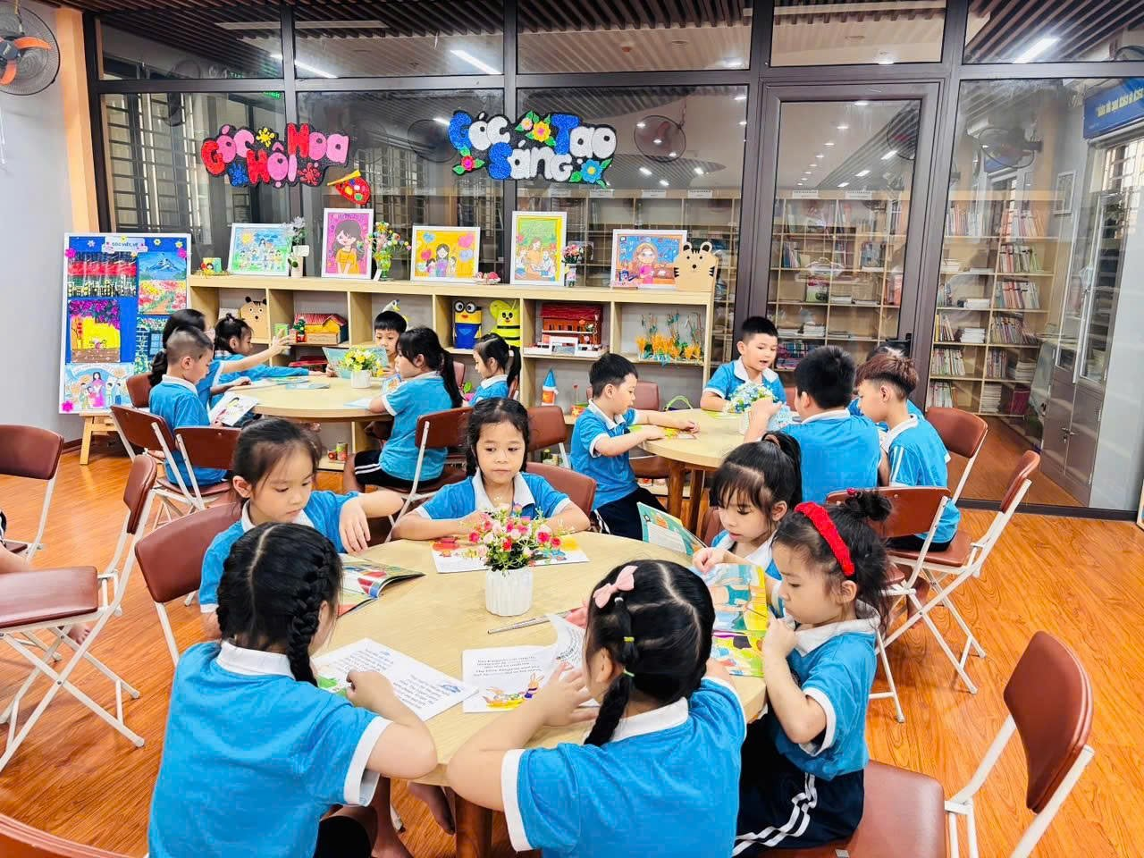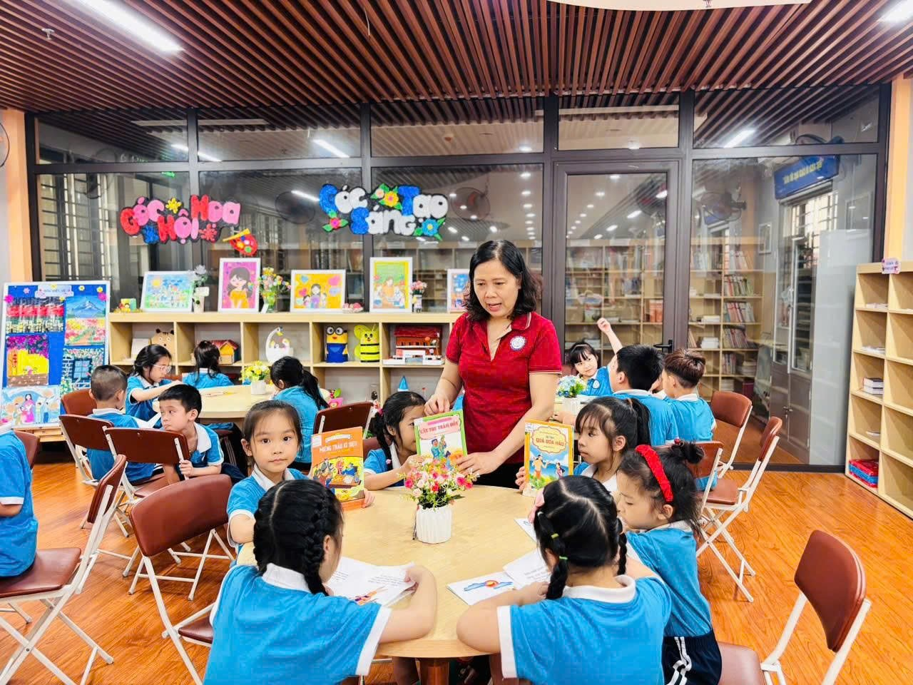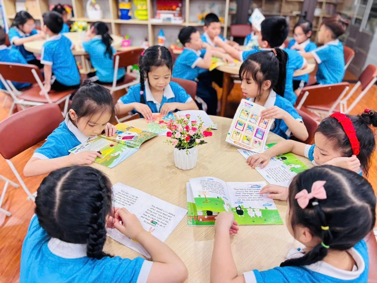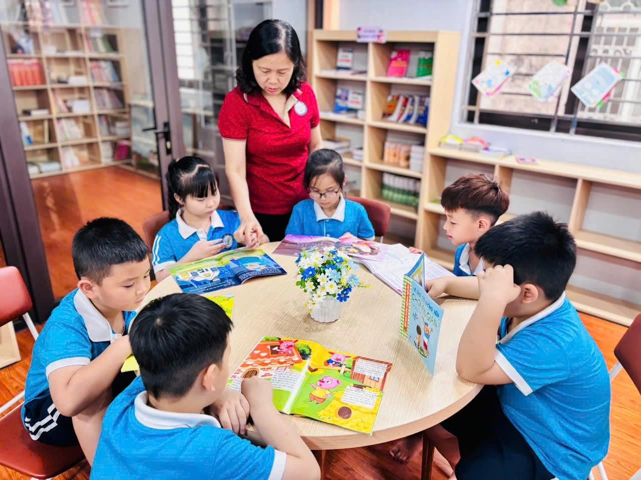 Tiếp đó, các em cùng nhau đọc sách, nghe kể chuyện và chia sẻ những điều mình cảm nhận; có bạn tưởng tượng cây đang vẫy tay chào, có bạn lại nghe thấy tiếng thì thầm của những chiếc lá, những cánh tay nhỏ xinh liên tục giơ lên mang theo biết bao suy nghĩ ngây thơ và đáng yêu, làm cho không khí lớp học trở nên rộn ràng, vui tươi. Thông qua các hoạt động nhẹ nhàng và gần gũi ấy, các em dần hiểu rằng thiên nhiên cũng là người bạn thân thiết quanh mình, từ đó biết yêu quý, chăm sóc cây cối và thêm hứng thú với việc đọc sách mỗi ngày, để mỗi trang sách mở ra không chỉ là câu chuyện mà còn là một thế giới nhỏ nuôi dưỡng những tình cảm đẹp đẽ, trong trẻo trong tâm hồn các em. 🌱