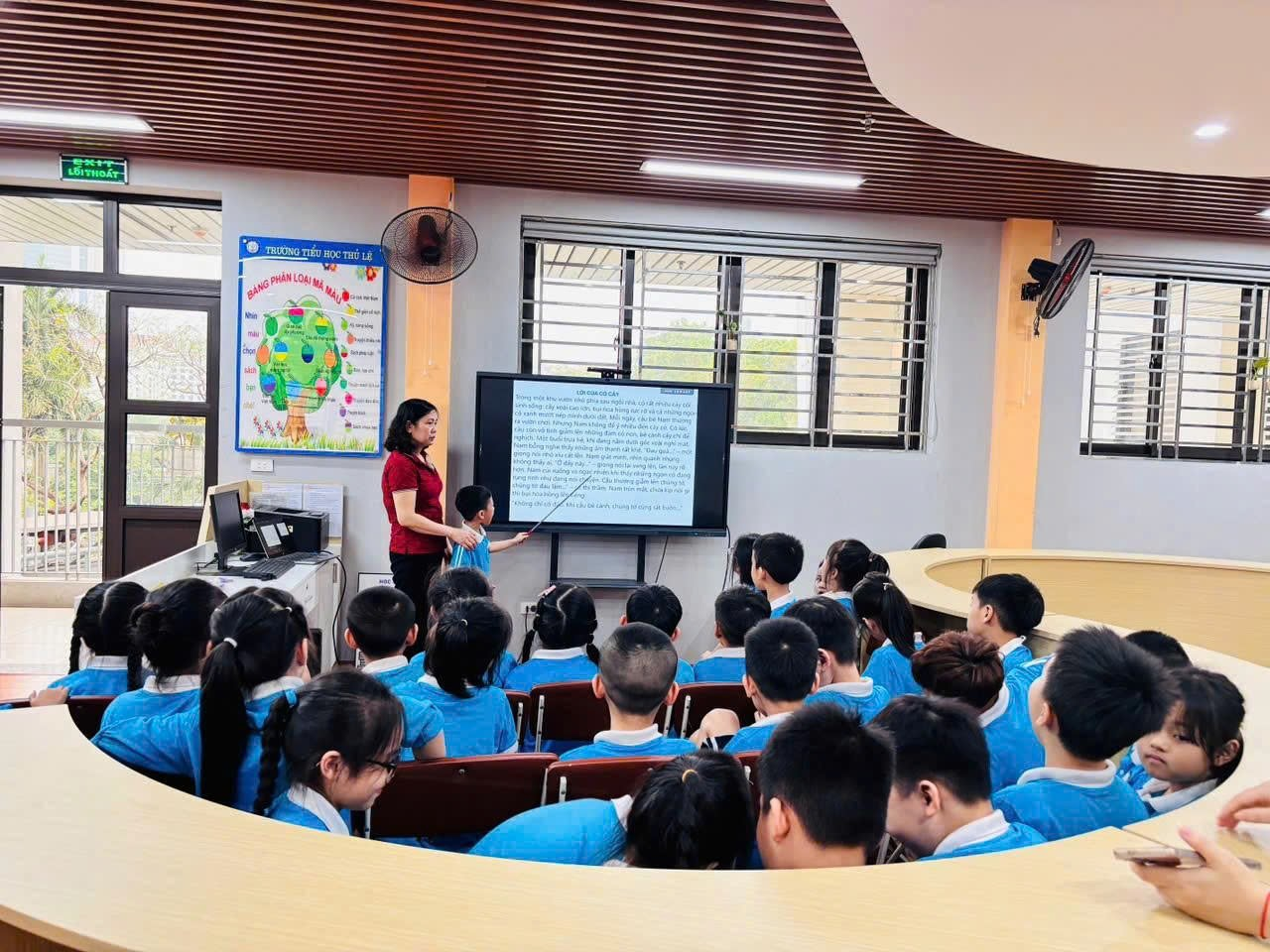 Mở đầu tiết học, cô giáo nhẹ nhàng dẫn dắt các em bước vào thế giới của cỏ cây qua những bức tranh sinh động và những câu chuyện ngắn đầy màu sắc, khiến các bạn nhỏ chăm chú lắng nghe và háo hức khám phá xem cỏ cây “nói” gì với mình 🌿