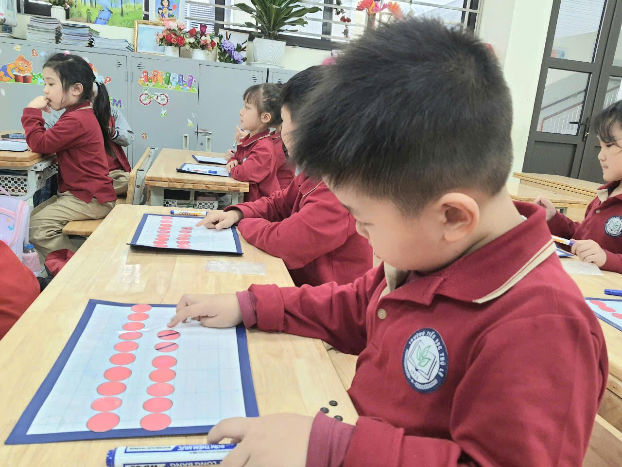 Các con học sinh sử dụng đồ dùng trong giờ học Toán