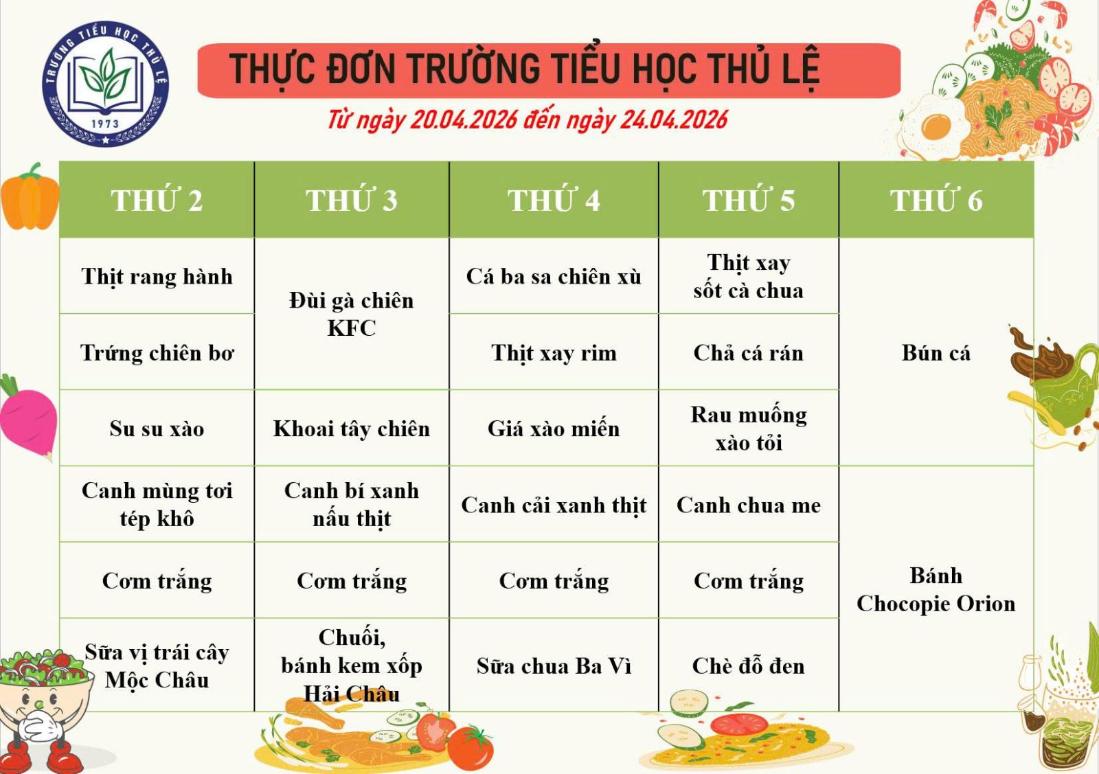 Nhà trường gửi tới các bậc PH và các con HS thực đơn tuần 4 tháng 4/2026. Trân trọng!