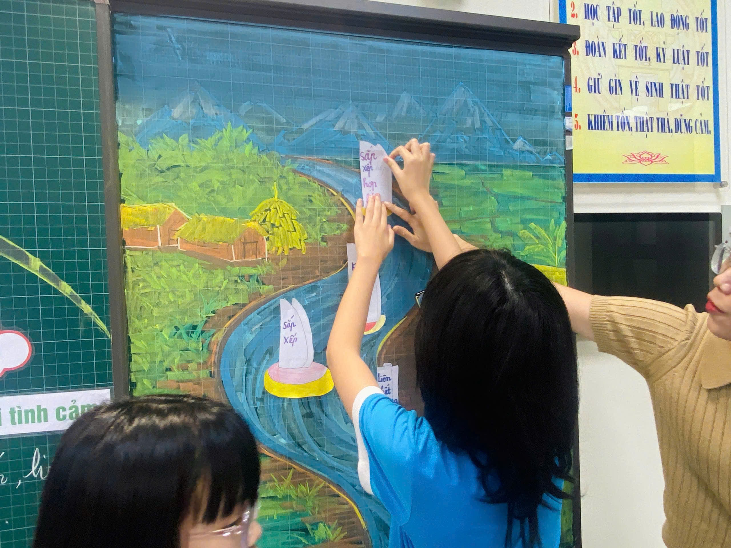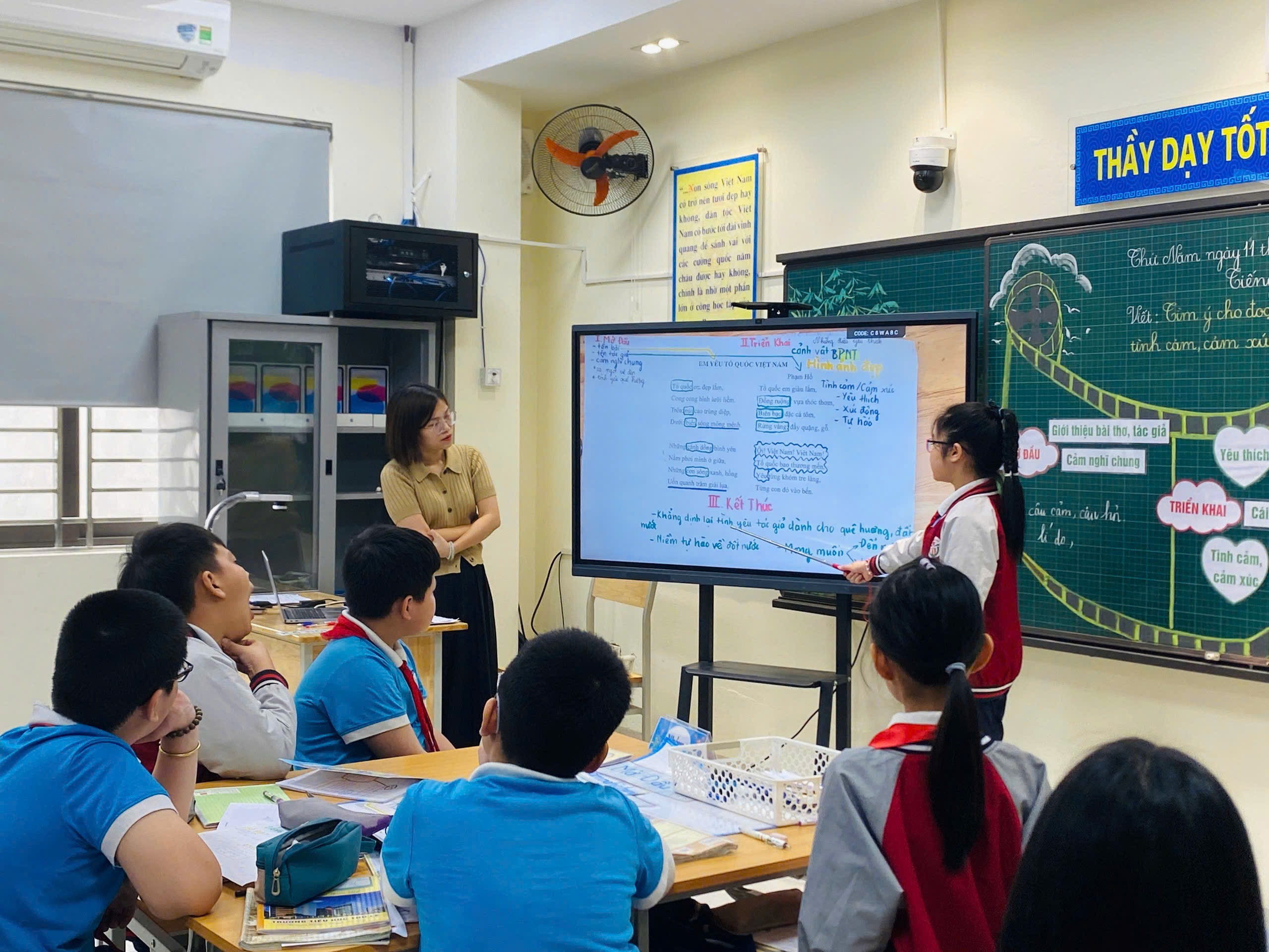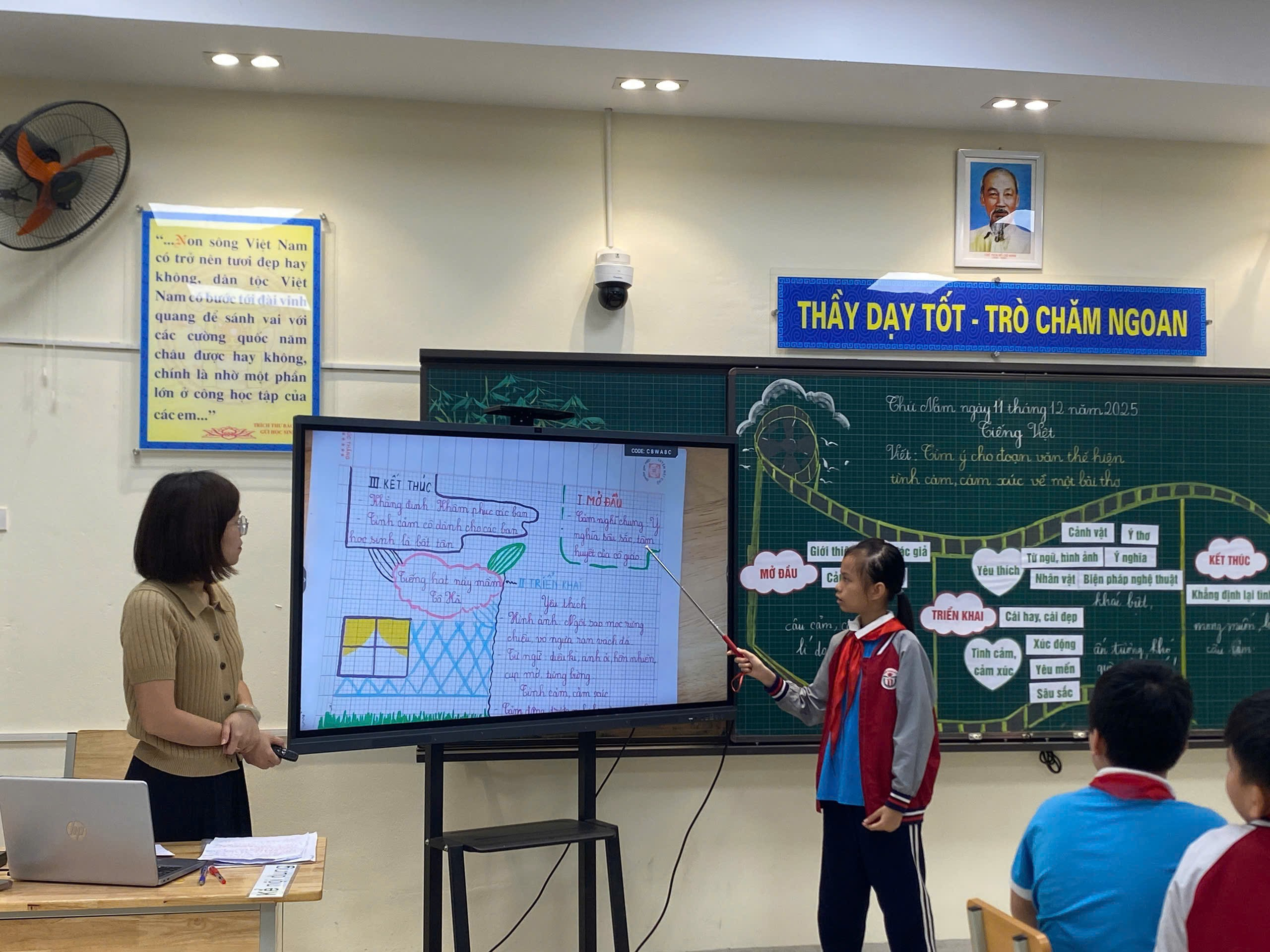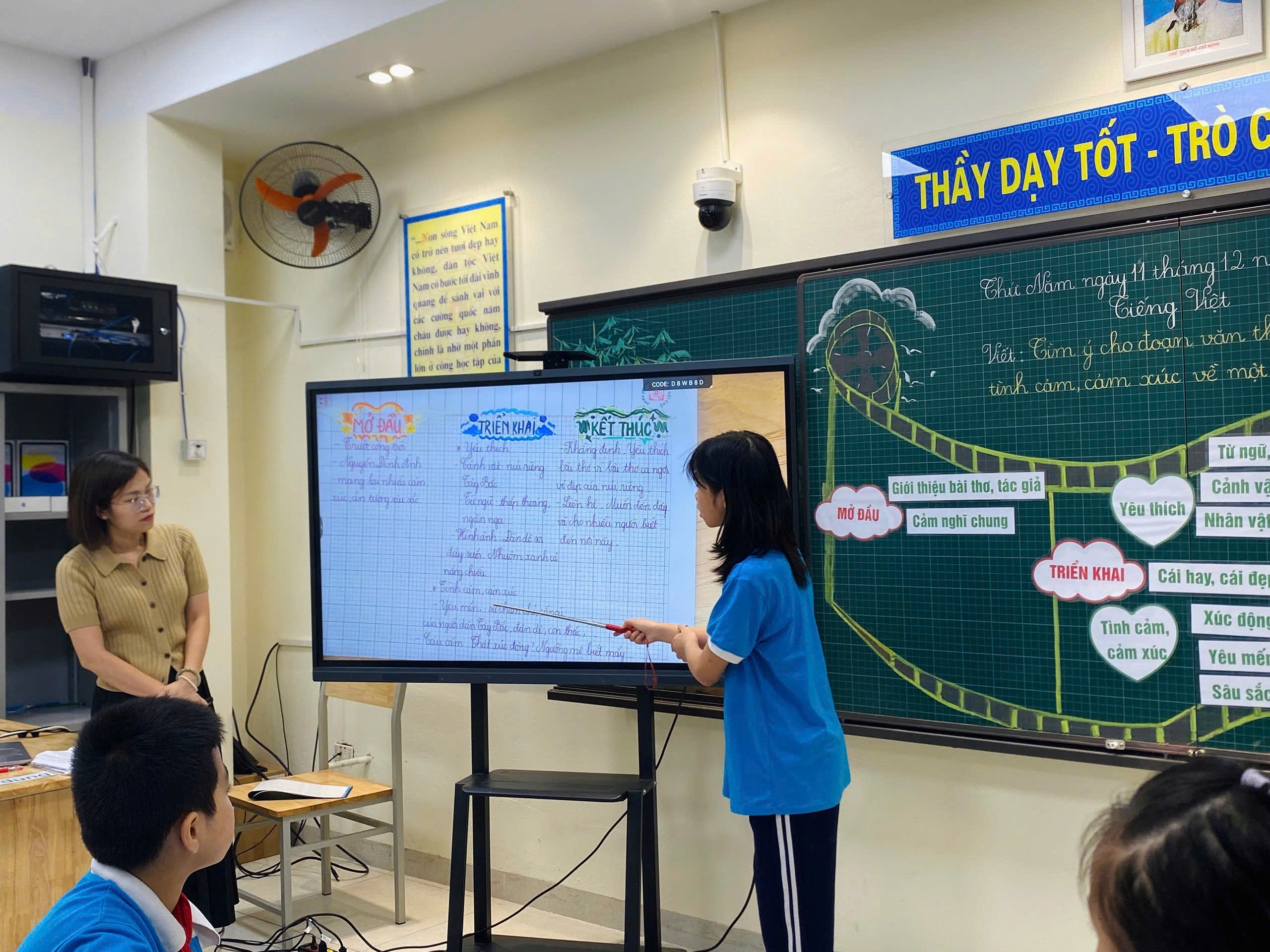 Trong suốt bài dạy, cô Mai Phương đã vận dụng linh hoạt nhiều phương pháp dạy học tích cực như trò chơi học tập, thảo luận nhóm, sơ đồ tư duy và đặc biệt là ứng dụng công nghệ thông tin. Dưới sự hướng dẫn tỉ mỉ, khoa học của cô, học sinh được phát huy tối đa sự chủ động và sáng tạo: các em tự lựa chọn bài thơ yêu thích, lập dàn ý và trình bày theo cách riêng của mình. Không chỉ vậy, các em còn được khuyến khích chia sẻ, nhận xét và bổ sung cho bài làm của bạn dựa trên những tiêu chí rõ ràng. Nhờ đó, tiết học diễn ra tự nhiên, sôi nổi và tràn đầy hứng khởi.