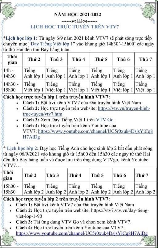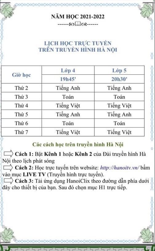 Trường TH Thủ Lệ thông báo Lịch phát sóng dạy học trực tuyến trên truyền hình