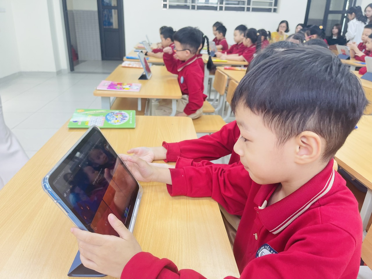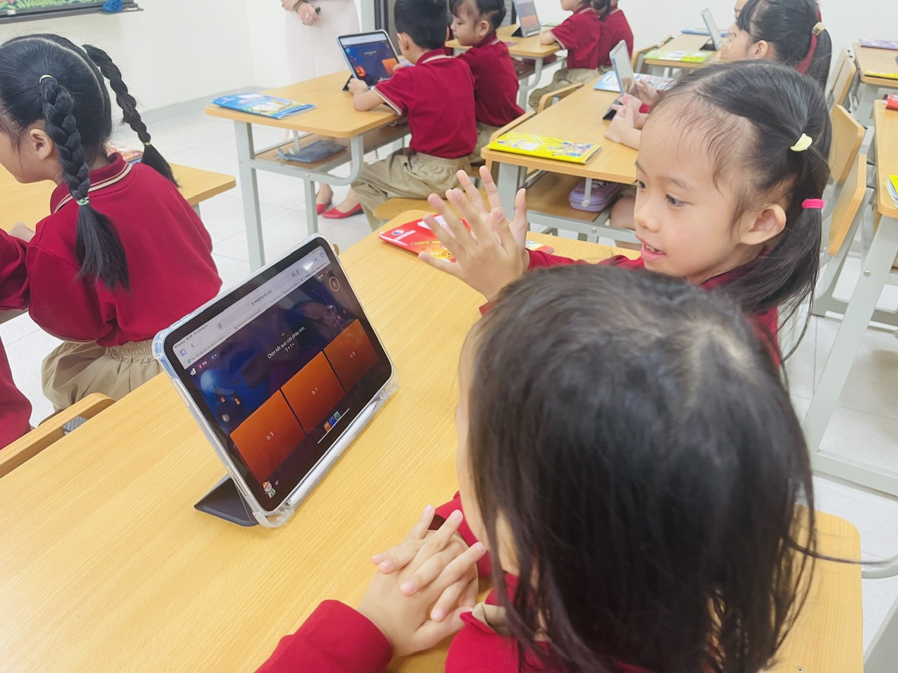 Điểm nổi bật của tiết học là việc ứng dụng thiết bị iPad trong tổ chức các hoạt động học tập. Thông qua phần mềm hỗ trợ và trò chơi tương tác, học sinh được trải nghiệm bài học một cách sinh động, trực quan và hiện đại. Việc sử dụng iPad giúp các em thực hành phép cộng nhanh – chính xác – hứng thú hơn, đồng thời rèn luyện kỹ năng tư duy, hợp tác nhóm và làm việc với công nghệ ngay từ bậc Tiểu học.