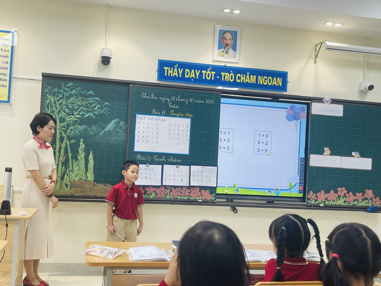 Các bạn học sinh lớp 1A cùng cô Hồng Vân trong giờ học môn Toán