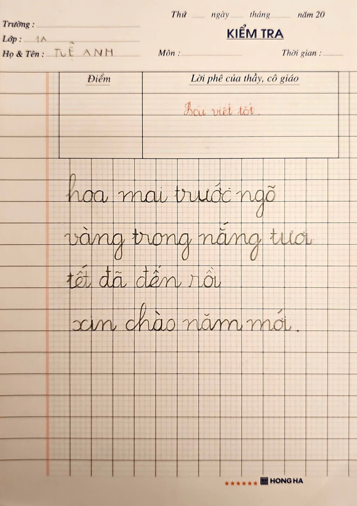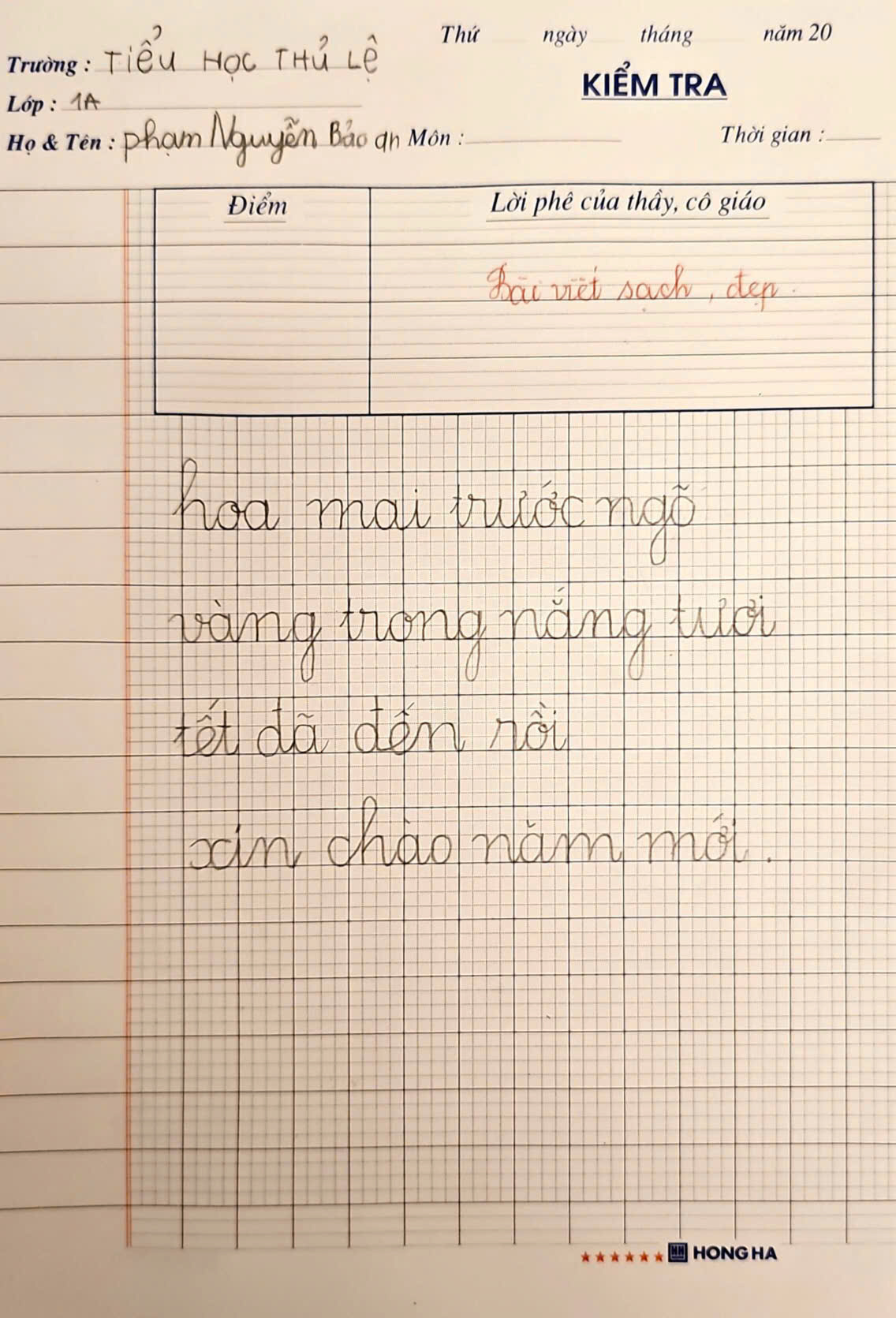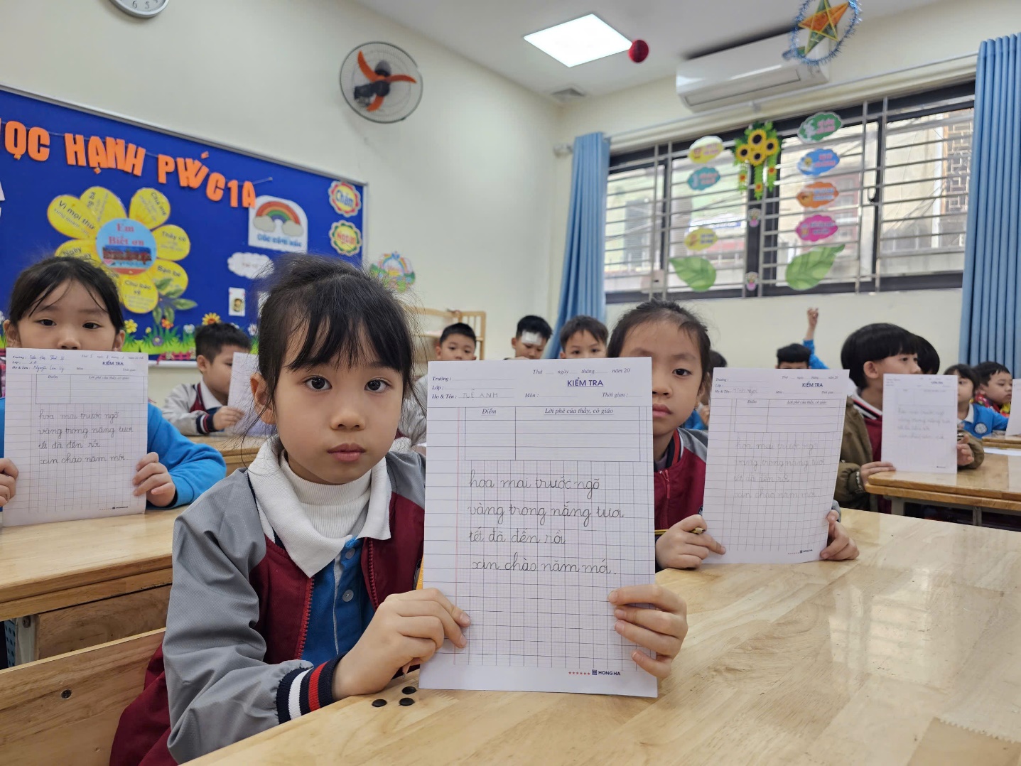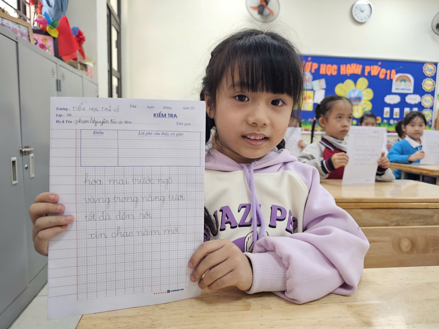 Thông qua phần thể hiện chữ viết, các em đã từng bước hình thành kỹ năng viết đúng, viết rõ ràng, đều nét; đồng thời bộc lộ sự tự tin và tiến bộ rõ rệt sau thời gian học tập và rèn luyện. Đây không chỉ là hoạt động đánh giá mà còn là dịp ghi nhận sự cố gắng của mỗi học sinh lớp 1A trên hành trình làm quen với con chữ.