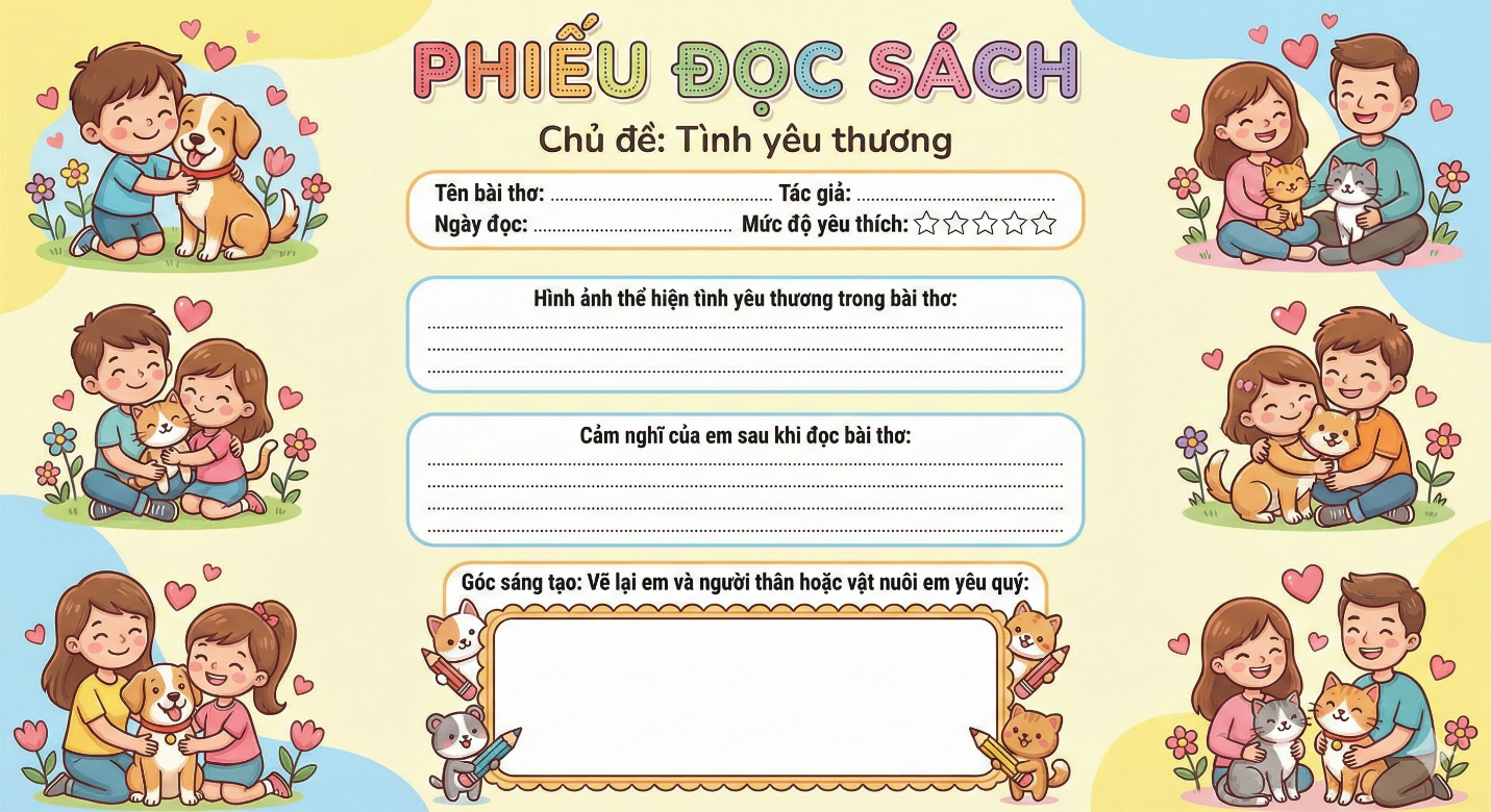 Nội dung trọng tâm của tiết học là đọc và trao đổi về tình yêu thương giữa con người với con người, hoặc giữa con người với loài vật. Từ gợi ý trong sách, các con được làm quen và lựa chọn đọc các bài thơ trong tập Góc sân và khoảng trời của nhà thơ Trần Đăng Khoa.