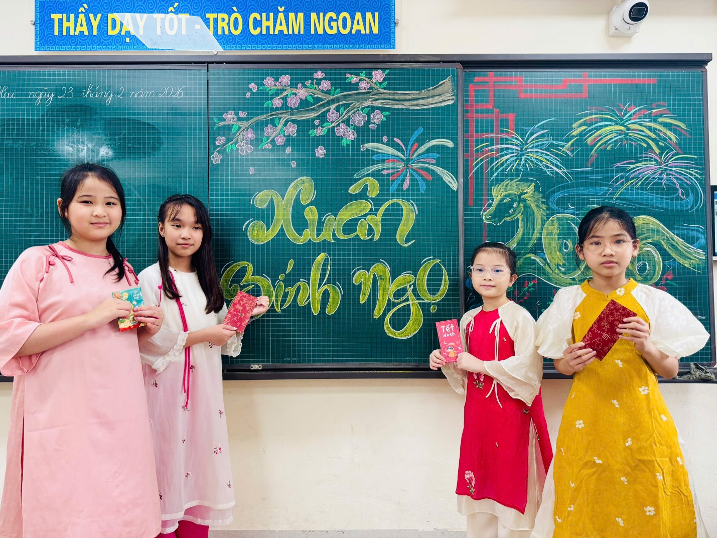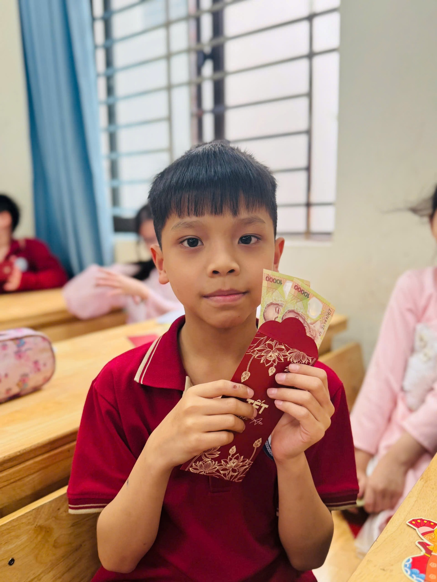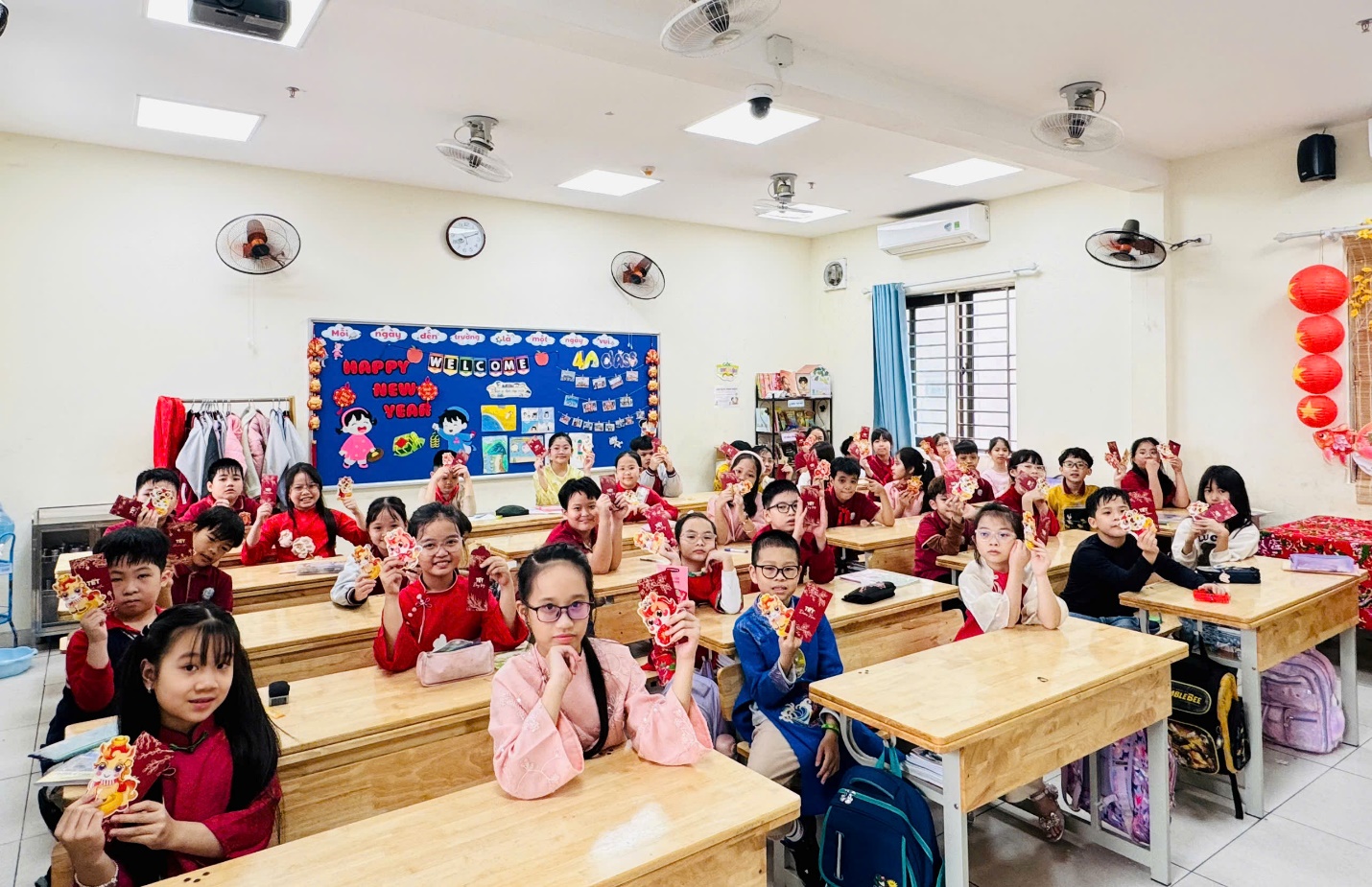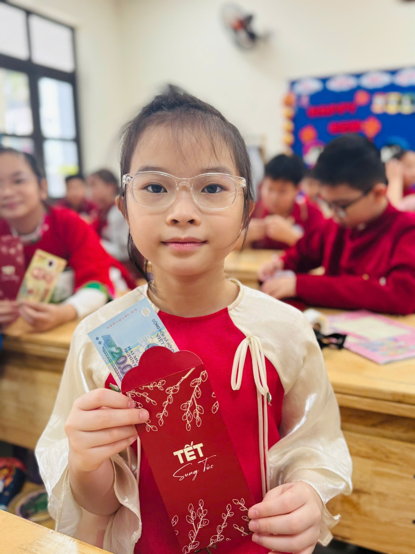 Đặc biệt, niềm vui như nhân đôi khi các con được nhận những phong bao lì xì yêu thương từ các bác phụ huynh. Từng phong bao đỏ thắm không chỉ là món quà đầu năm mà còn chứa đựng sự quan tâm, động viên và những lời chúc tốt đẹp dành cho tập thể lớp 4A.