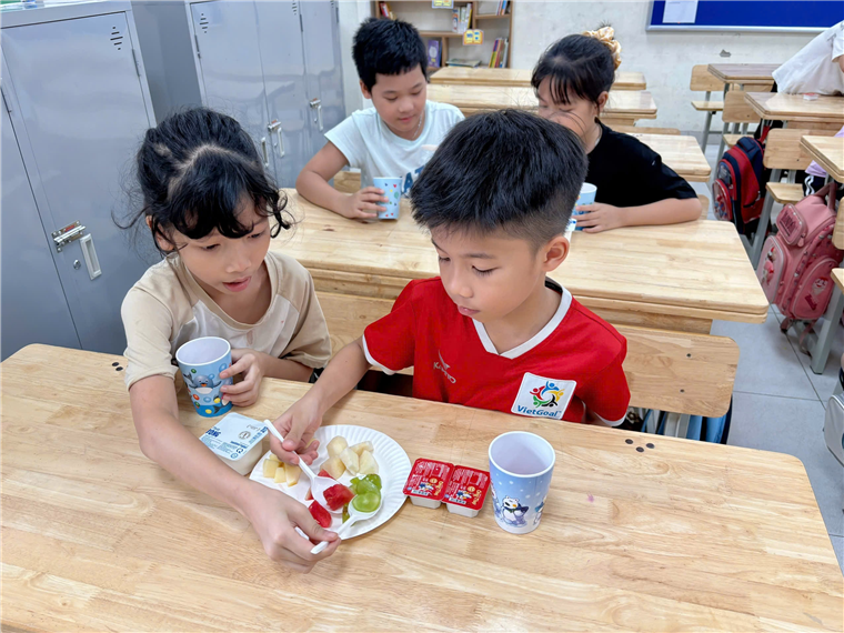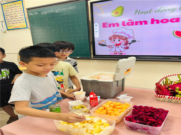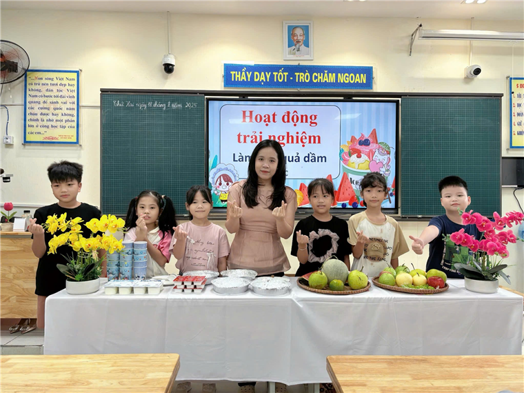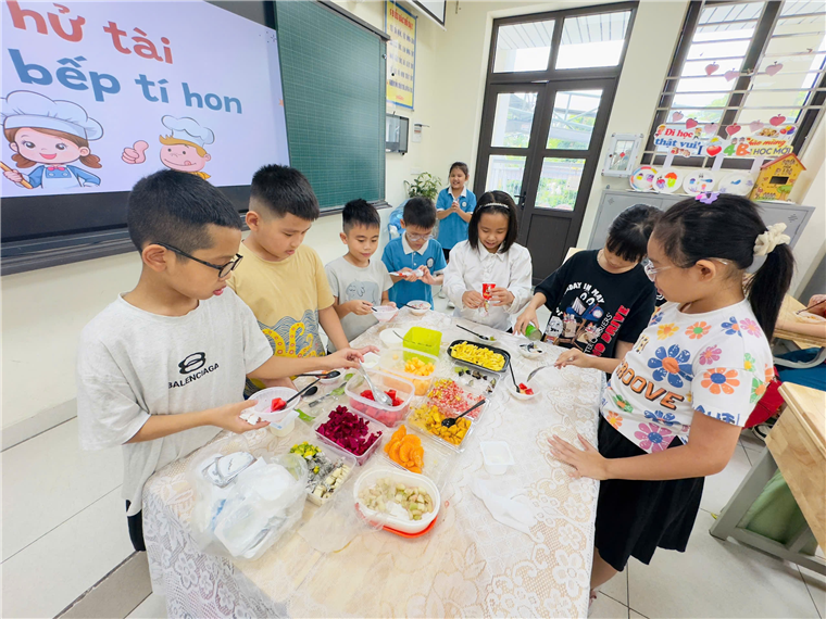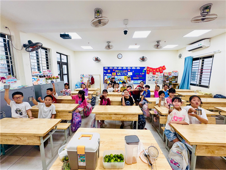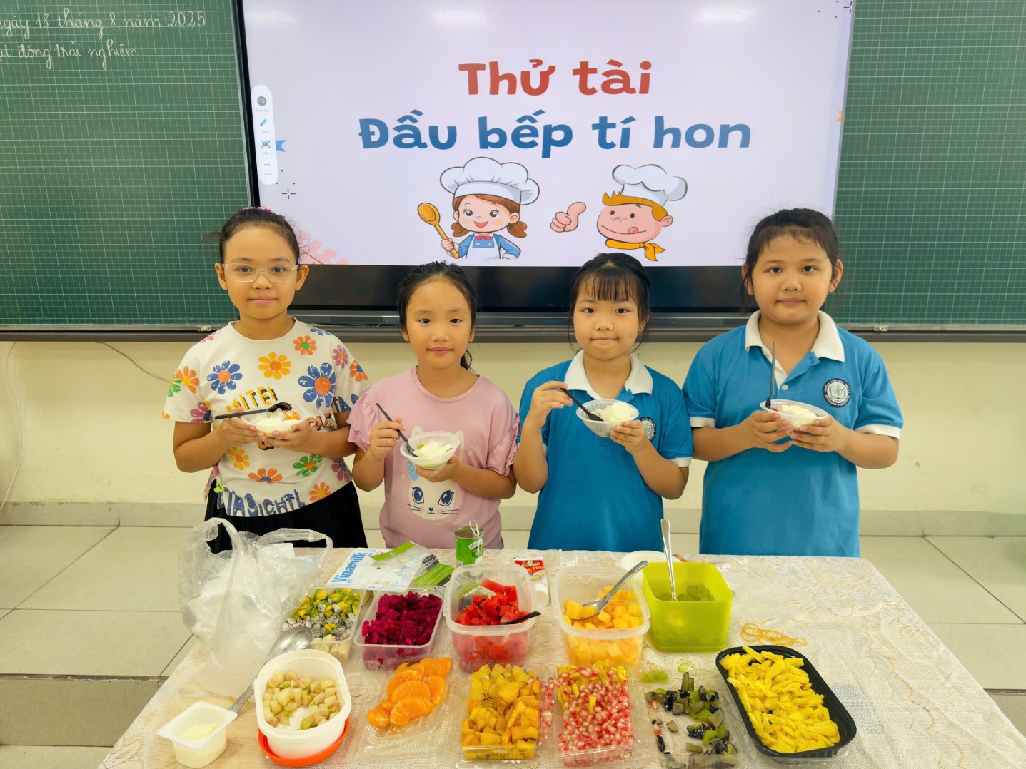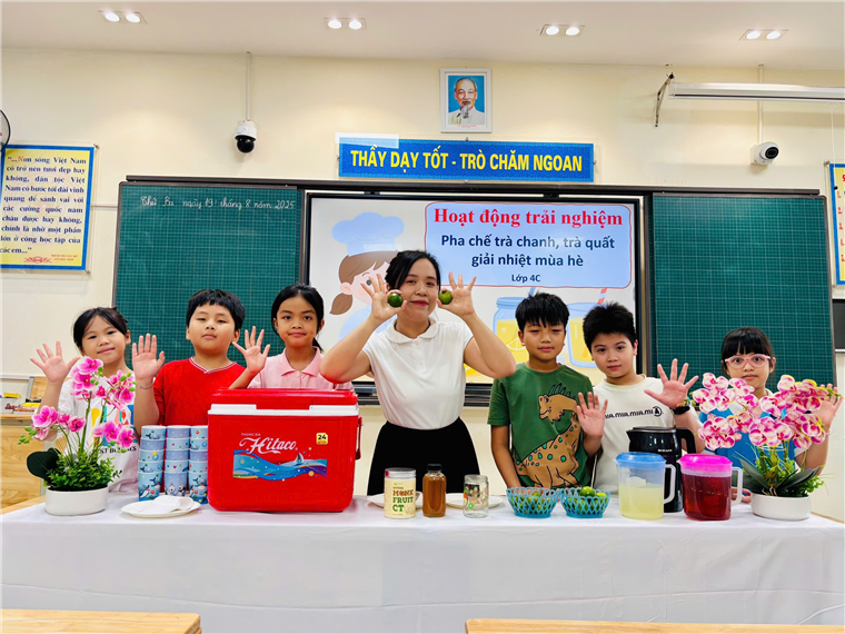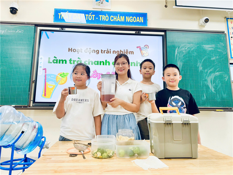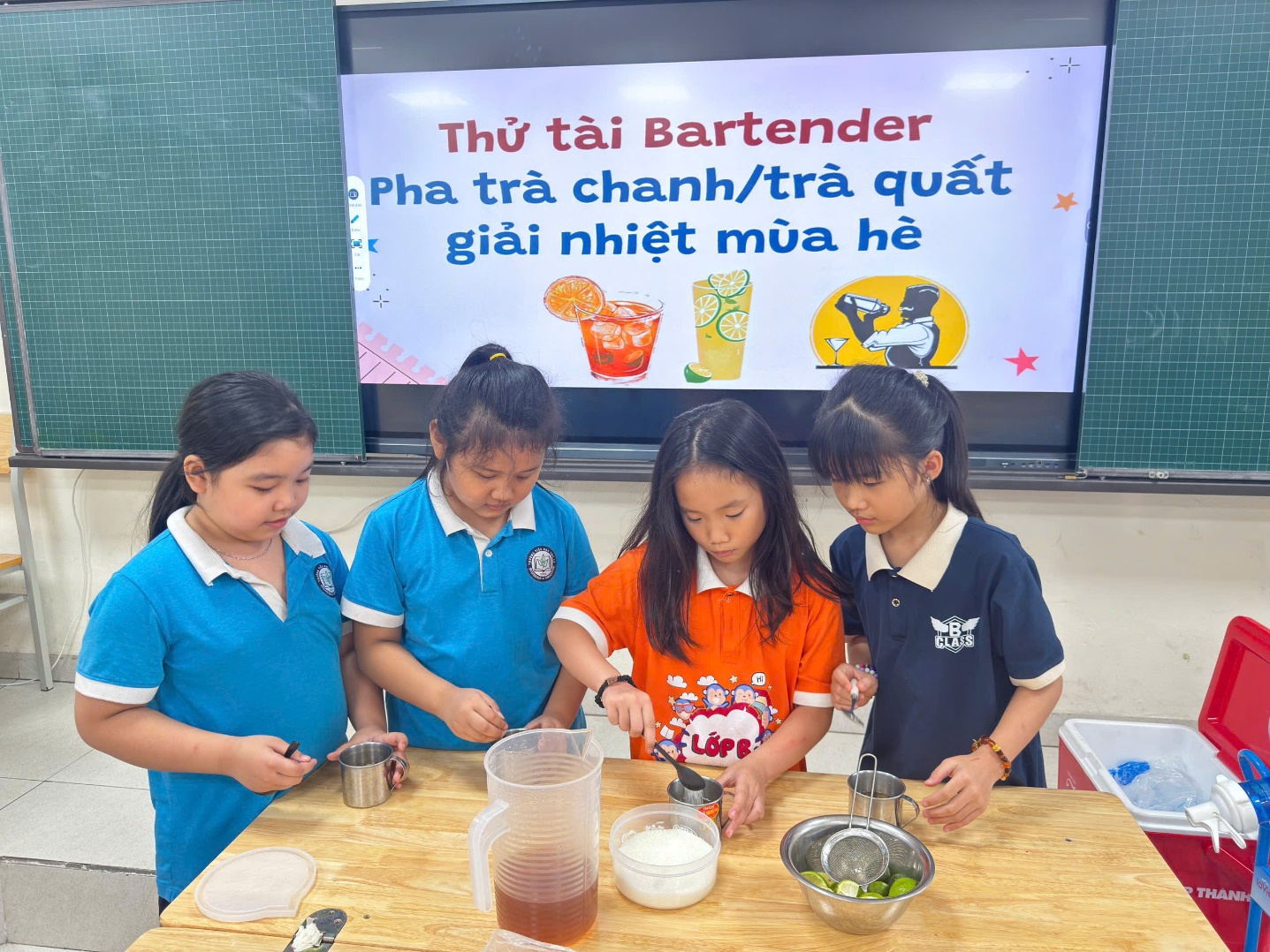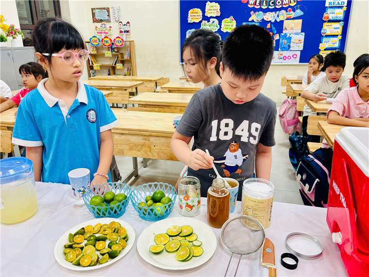 Một trong những hoạt động được các bạn nhỏ mong chờ nhất là hoạt động trải nghiệm làm trà chanh/trà quất giải nhiệt và làm sữa chua hoa quả. Dưới sự hướng dẫn của các cô giáo, các em được tự tay pha nước cốt chanh, thêm đá và đường theo khẩu vị riêng. Những ly trà chanh/trà quất mát lạnh hay cốc sữa chua hoa quả đủ màu sắc được chính tay các em làm ra không chỉ khiến các em thích thú mà còn giúp các em hiểu hơn về giá trị của thực phẩm sạch và sự kỳ công trong từng công đoạn chế biến.