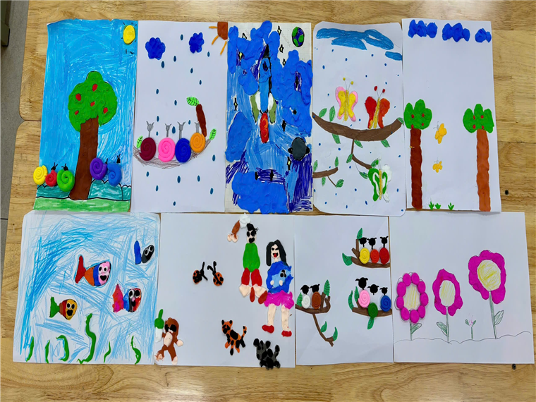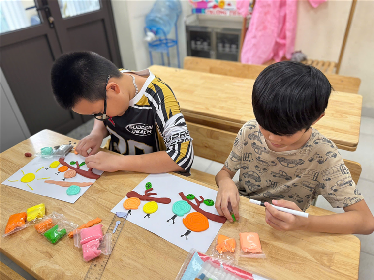 Không dừng lại ở đó, các em còn được thỏa sức sáng tạo với hoạt động nặn tranh bằng đất sét tự khô. Từ những khối đất sét màu sắc rực rỡ, dưới bàn tay khéo léo và trí tưởng tượng phong phú, các em đã tạo nên những bức tranh sống động: cánh đồng hoa, ngôi nhà mơ ước, hay những con vật ngộ nghĩnh. Mỗi tác phẩm là một câu chuyện nhỏ, thể hiện góc nhìn ngây thơ và đầy sáng tạo của lứa tuổi tiểu học.
