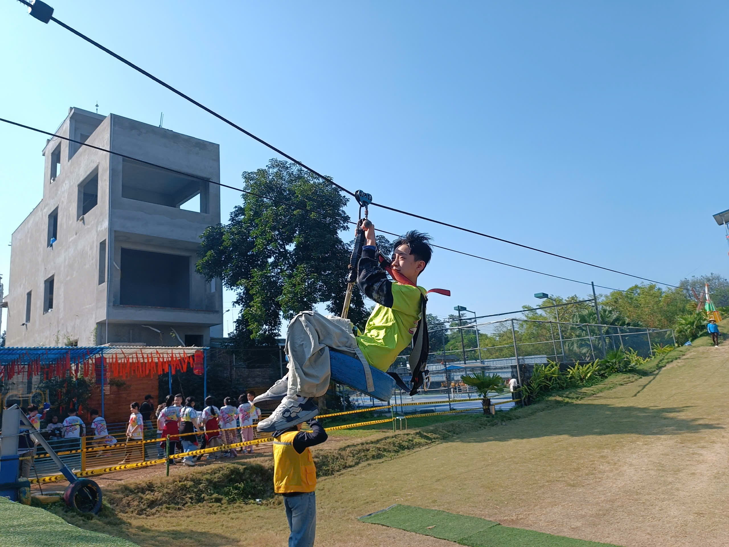 Các bạn học sinh đang chinh phục mọi giới hạn tại khu vui chơi Làng Mô