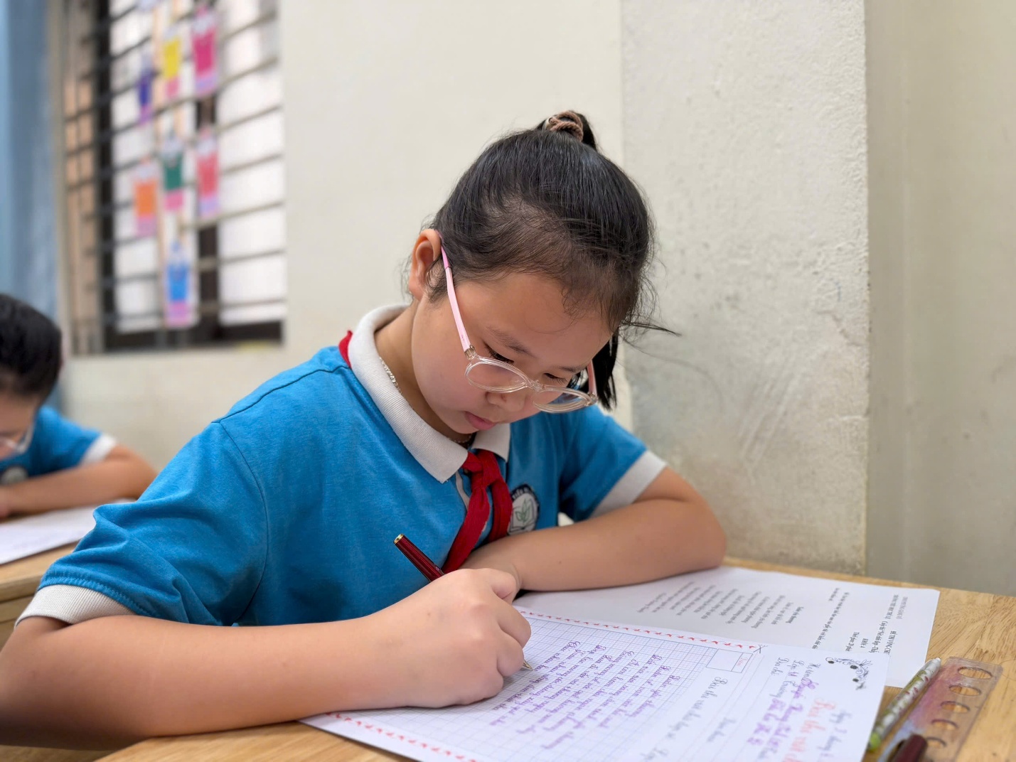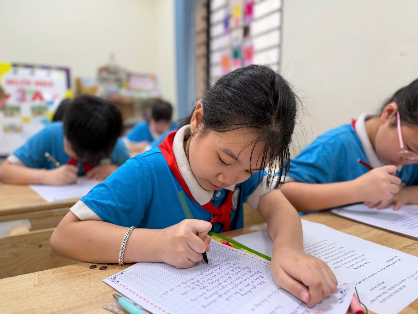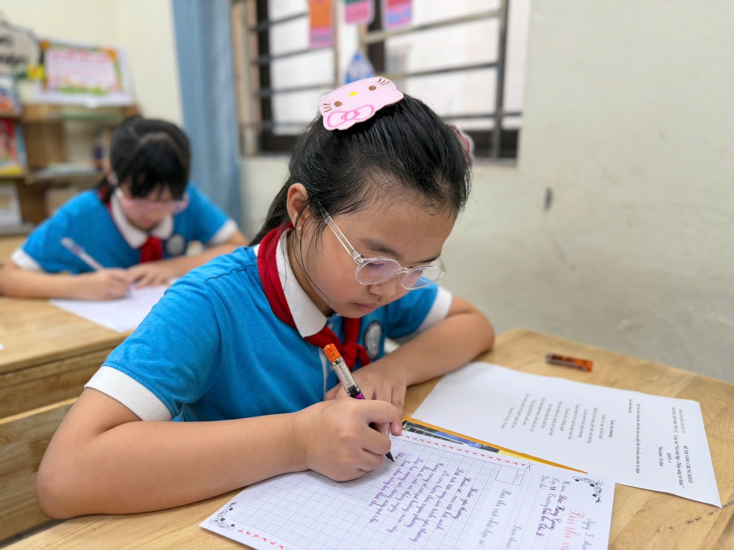 Trong không khí trang nghiêm nhưng cũng đầy hào hứng, các em học sinh đã chăm chú, tỉ mỉ viết từng nét chữ. Dưới sự hướng dẫn tận tình của cô giáo, từng bài thi được các em trình bày sạch đẹp, đúng mẫu, thể hiện sự cẩn thận và tinh thần nghiêm túc. Những nét chữ tròn trịa, đều đặn không chỉ thể hiện kỹ năng viết mà còn phản ánh ý thức rèn luyện và sự kiên trì của mỗi học sinh.