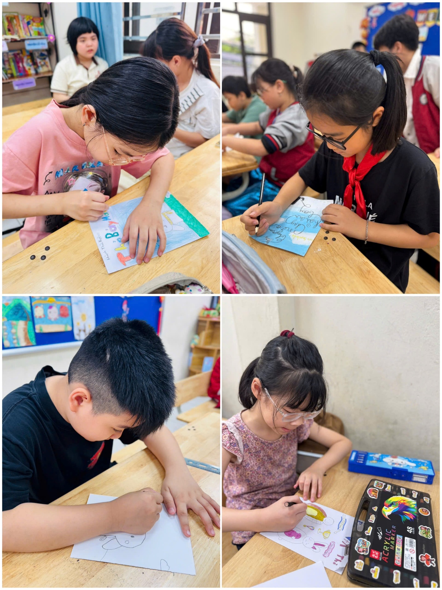 Trong những ngày qua, lớp 4A như được “khoác áo mới” bởi không khí học tập đầy hứng khởi. Các em học sinh tích cực tham gia cuộc thi thiết kế bìa sách, thể hiện sự sáng tạo qua từng nét vẽ, màu sắc sinh động và những ý tưởng độc đáo. Bên cạnh đó, hoạt động vẽ nhân vật truyện tranh cũng nhận được sự hưởng ứng nhiệt tình, giúp các em thỏa sức tưởng tượng và tái hiện lại những nhân vật yêu thích một cách đầy sống động.