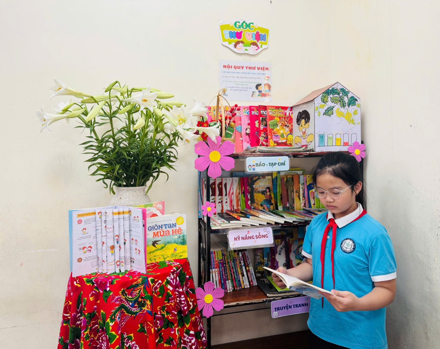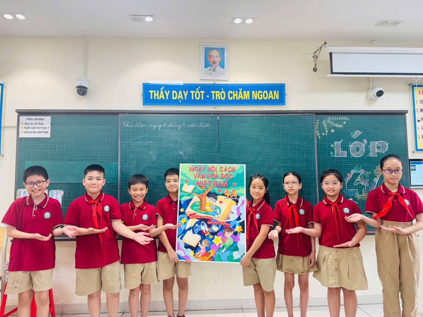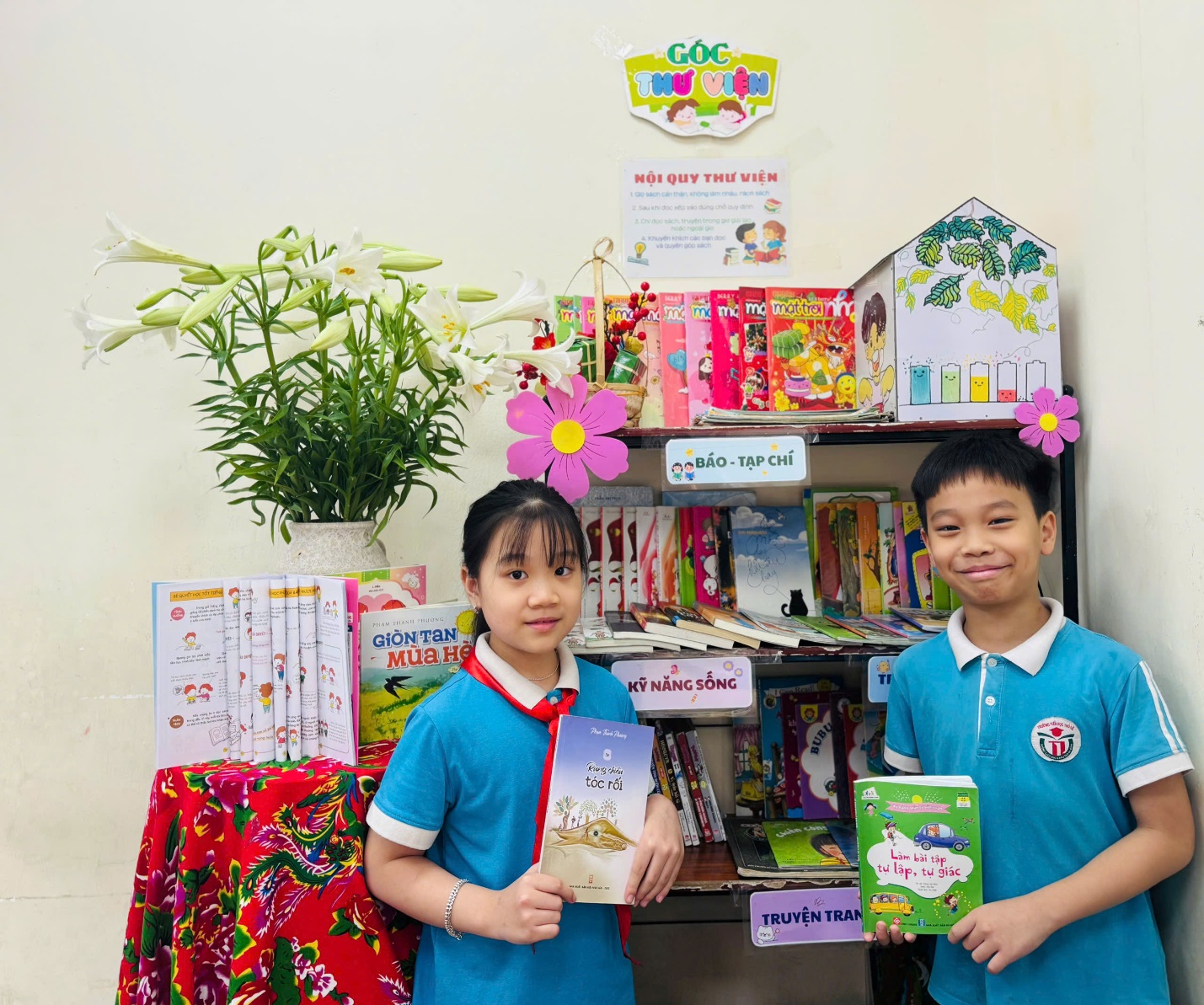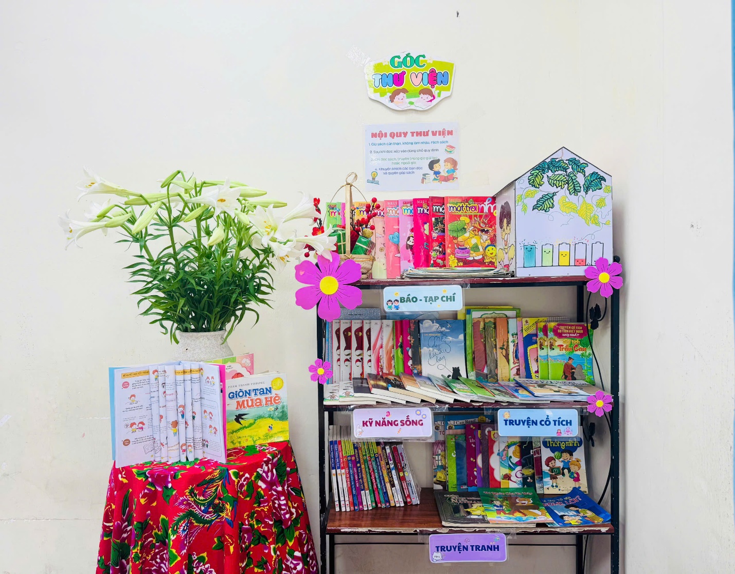 Không chỉ dừng lại ở đó, các em còn cùng nhau trang trí Góc Thư viện của lớp thật đẹp mắt, gọn gàng và gần gũi, tạo nên một không gian đọc sách thân thiện, thu hút. Tấm pano tuyên truyền được thiết kế công phu, mang thông điệp ý nghĩa về việc đọc sách cũng góp phần làm phong phú thêm hoạt động của lớp.