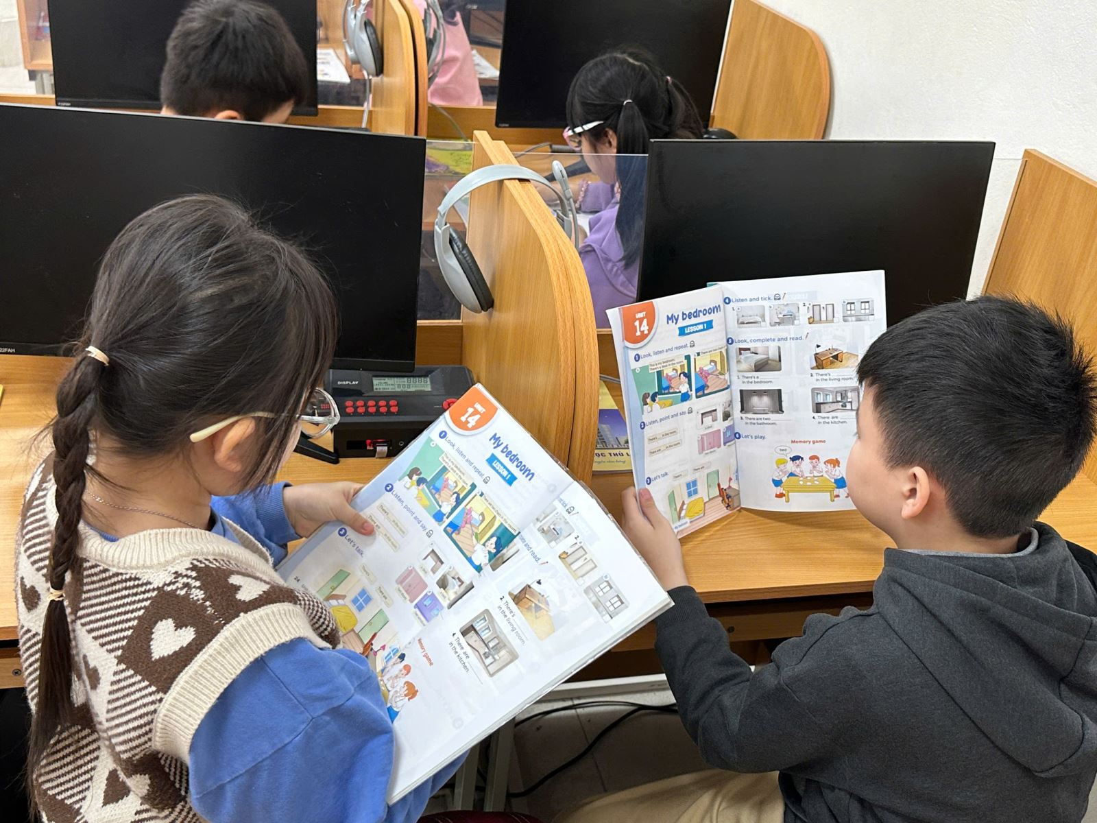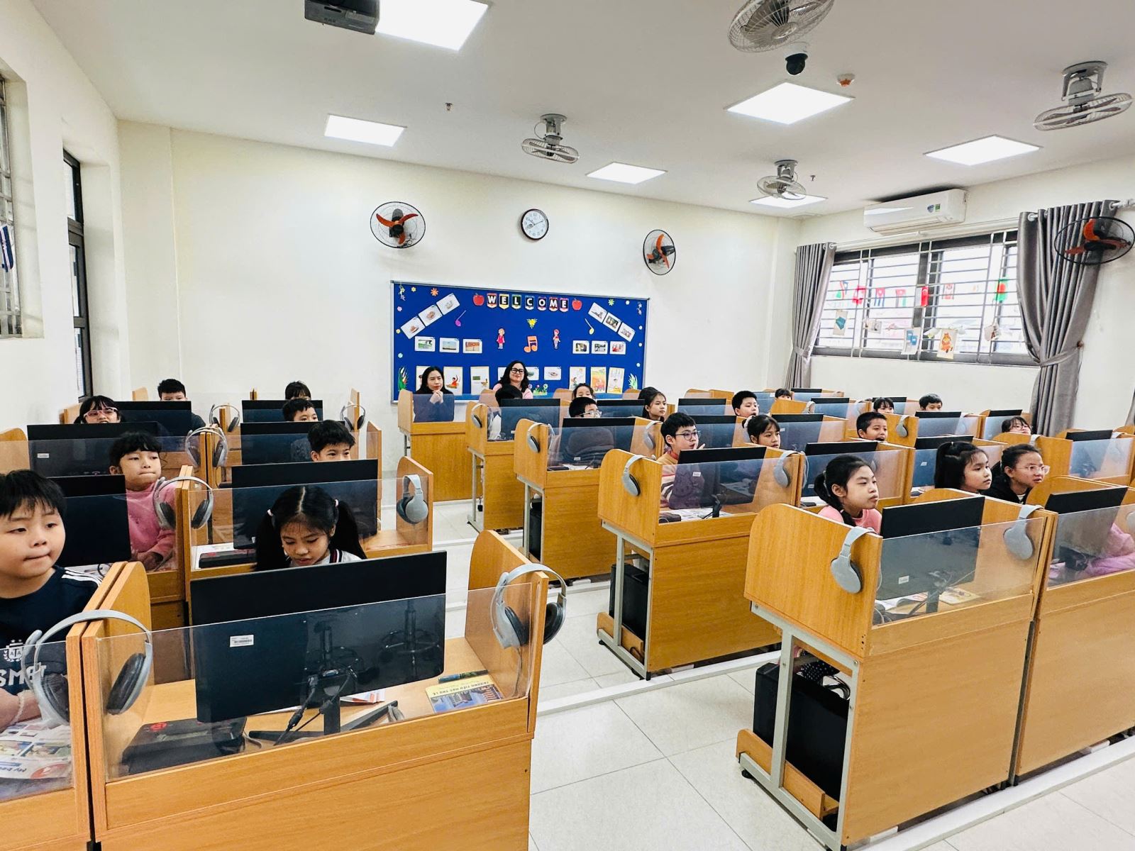 Học sinh tự tin giao tiếp và tương tác với màn hình thông minh trong tiết dạy môn Tiếng Anh của cô giáo Trần Thị Nhị Hồng.