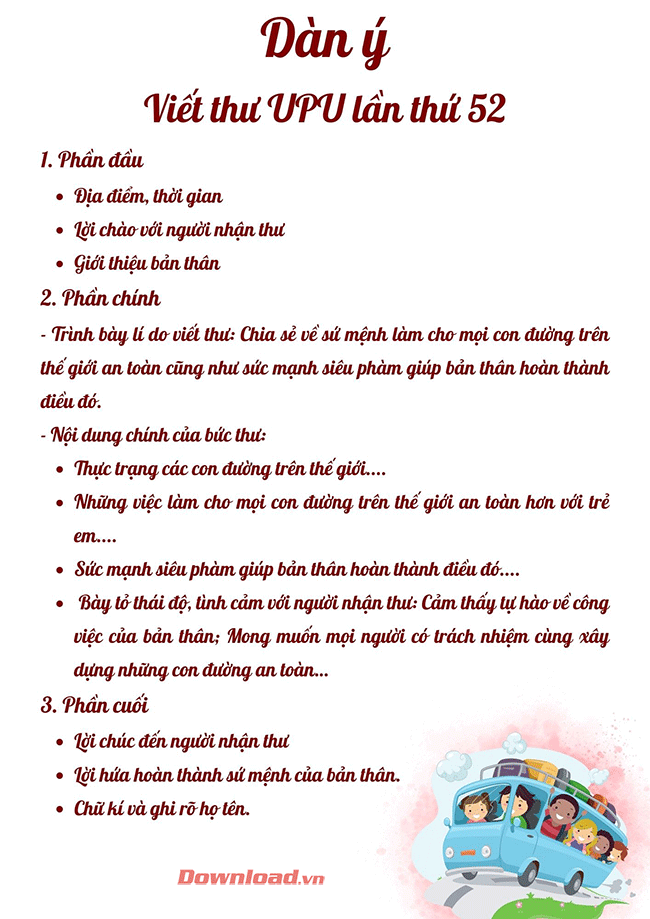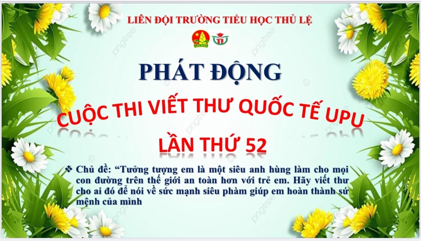 Tưởng tượng em là một siêu anh hùng mang sứ mệnh làm cho mọi con đường trên thế giới an toàn hơn với trẻ em. Hãy viết thư cho ai đó để nói về sức mạnh siêu phàm giúp em hoàn thành sứ mệnh của mình” (Tiếng Anh: Imagine you are a super hero and your mission is to make all roads around the world safer for children. Write a letter to someone explaining which super powers you would need to achieve your mission), cuộc thi Viết thư quốc tế UPU lần thứ 52 (2023) gắn với chương trình hành động của Liên Hợp Quốc thập niên thứ hai về cải thiện an toàn giao thông đường bộ. Cuộc thi là dịp để các em học sinh tìm hiểu kỹ hơn về Luật an toàn giao thông đường bộ, liên hệ những kiến thức thực tế trong quá trình tham gia giao thông đường bộ liên quan đến chính mình, nhận diện những vấn đề giao thông không an toàn ảnh hưởng đến trẻ em, đưa ra những hành động cụ thể và giải pháp khắc phục những vấn đề đó.