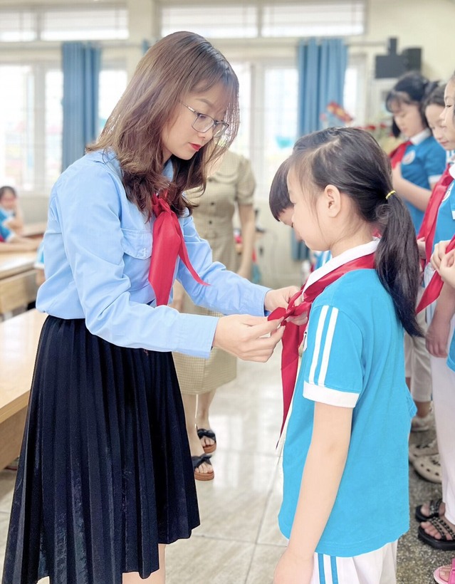 Cô giáo Trịnh Phương Linh - Bí thư Chi bộ, Hiệu trưởng nhà trường lên trao khăn quàng cho các bạn Đội viên mới.