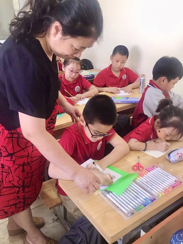 Cô giáo trực tiếp hướng dẫn học sinh sáng tạo những tấm thiệp ngộ nghĩnh.