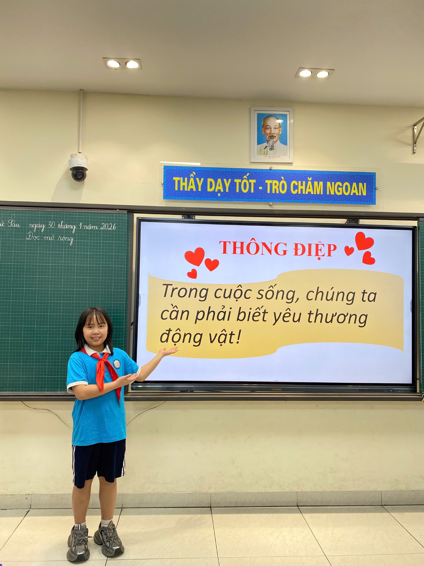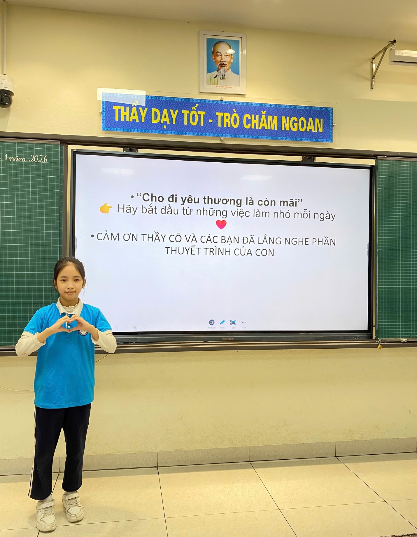 Sáng hôm sau, lớp học thật sự “bừng sáng” khi học sinh lần lượt tự tin đứng trước lớp thuyết trình. Mỗi câu chuyện là một gam màu: có câu chuyện khiến cả lớp lặng đi vì xúc động, có câu chuyện làm các bạn mỉm cười vì ấm áp, có câu chuyện giúp các con hiểu rằng yêu thương đôi khi bắt đầu từ những điều rất nhỏ: một lời nói tử tế, một hành động giúp đỡ, một sự chăm sóc dành cho loài vật. Các bạn lắng nghe chăm chú, hào hứng đặt câu hỏi, chia sẻ cảm nhận, cùng nhau rút ra bài học và thông điệp ý nghĩa. Giáo viên đã hỗ trợ chỉnh sửa nội dung, sắp xếp bố cục, điều chỉnh câu chữ và thông điệp để bài trình bày của các con rõ ràng, đúng trọng tâm và giàu cảm xúc hơn.