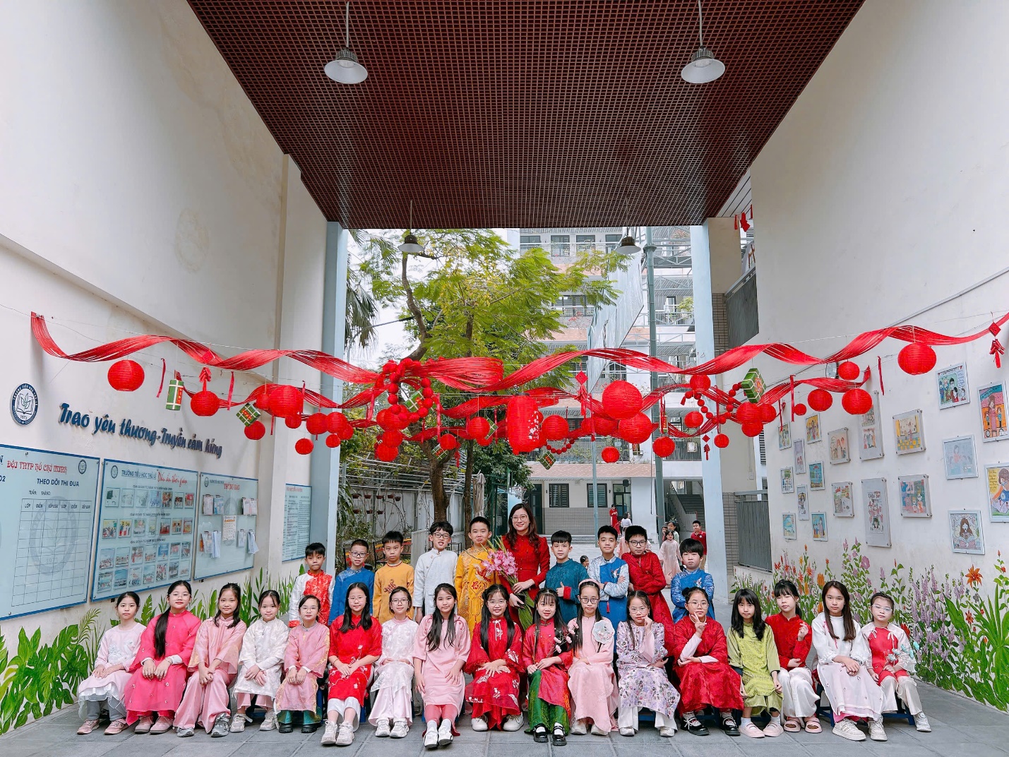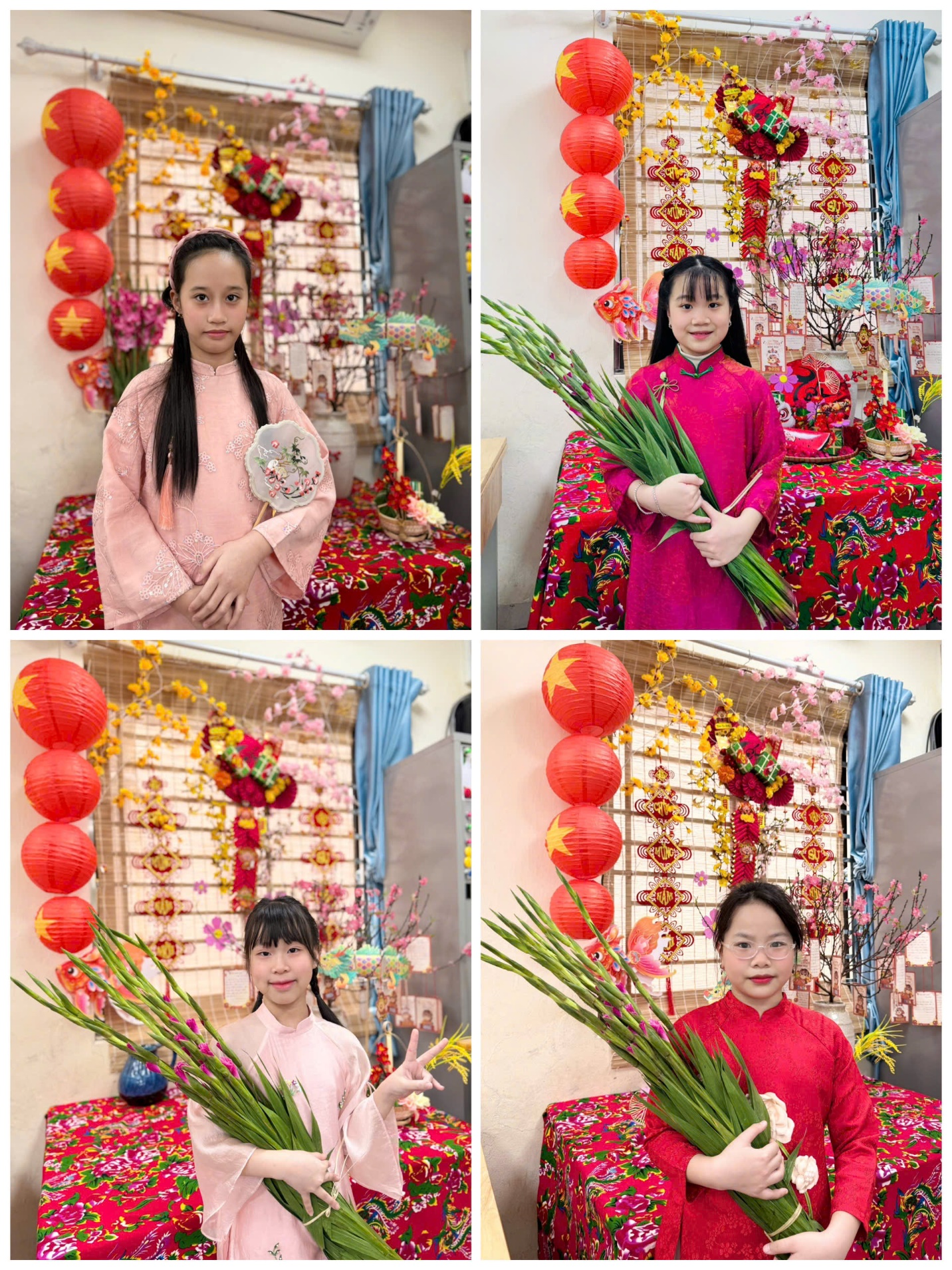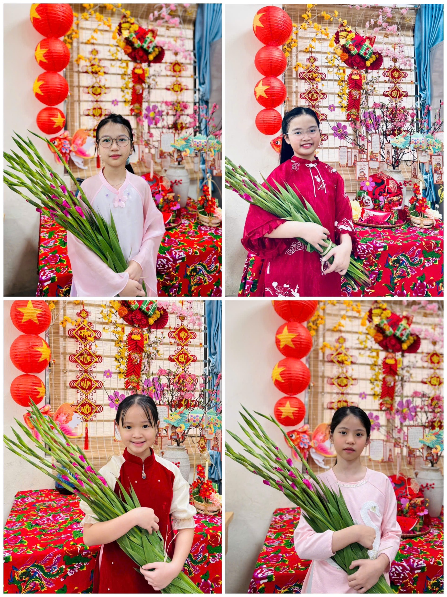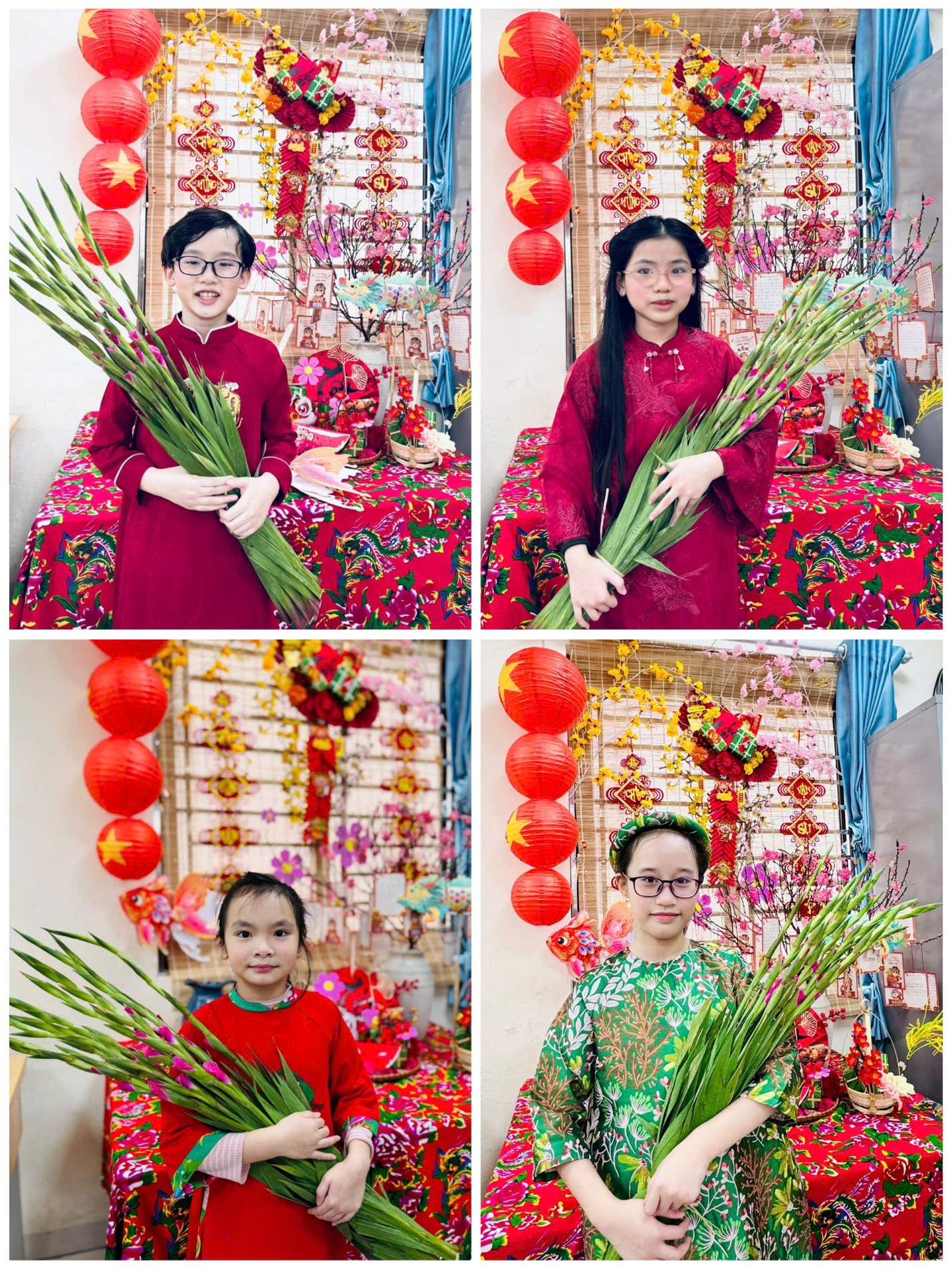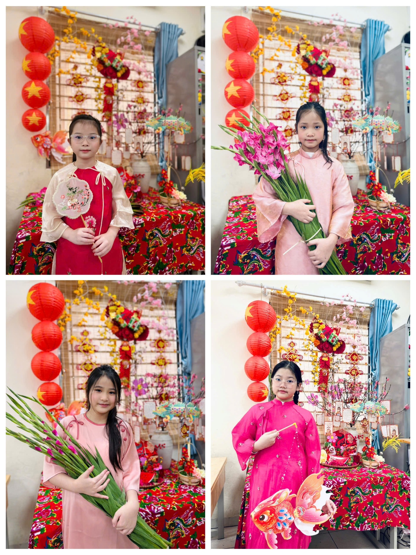 Dưới bàn tay khéo léo và sự sáng tạo của cô giáo và các bác phụ huynh, không gian lớp học 4A khoác lên mình “chiếc áo mới” rực rỡ sắc xuân. Những chiếc đèn lồng đỏ thắm, câu đối chúc xuân, cành đào thắm tươi và các vật trang trí truyền thống được chuẩn bị, sắp xếp gọn gàng đẹp mắt. Đặc biệt, hình ảnh các bạn học sinh trong trang phục áo dài truyền thống, tay nâng những bó hoa lay ơn, nụ cười rạng rỡ đã tạo nên một bức tranh mùa xuân thật trong trẻo và ấm áp.
