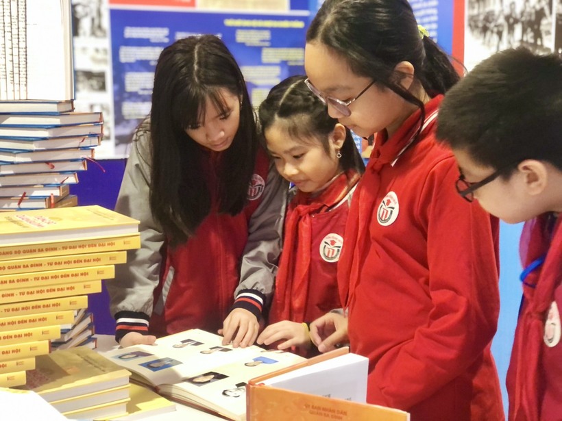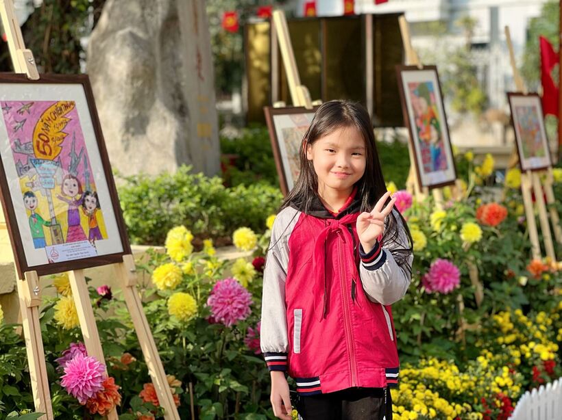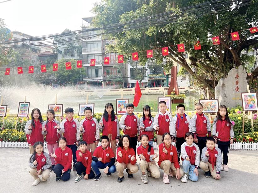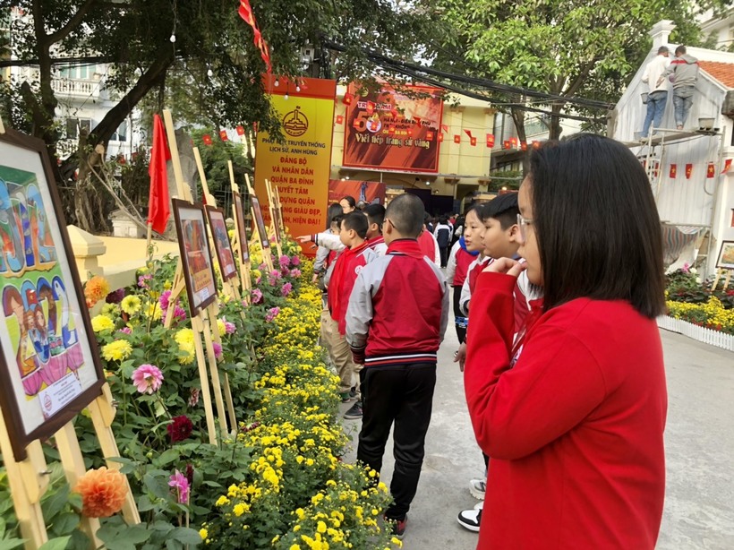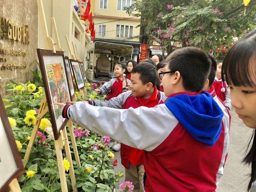 Hành trình tiếp theo, học sinh được ngắm nhìn những bức tranh đã đạt giải trong cuộc thi vẽ tranh chào mừng kỷ niệm “50 năm chiến thắng Hà Nội - Điện Biên Phủ trên không” của quận Ba Đình.