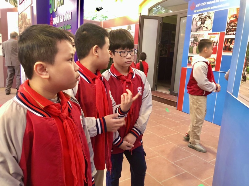 Học sinh hào hứng khám phá triển lãm qua lời dẫn của hướng dẫn viên.