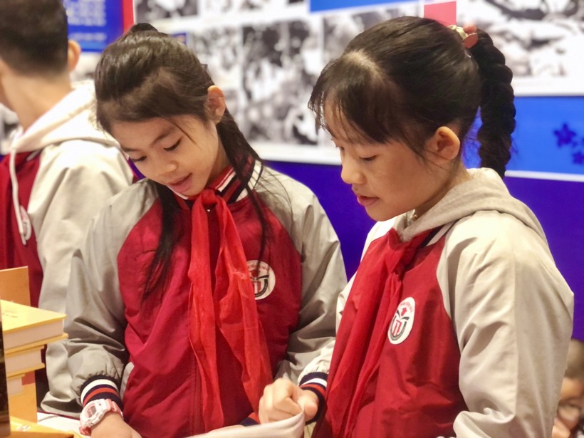 Học sinh hào hứng khi được gặp gỡ và trò chuyện cùng các ông, bà Cựu chiến binh phường Ngọc Hà.