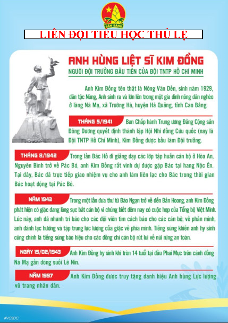Sáng ngày 13/02/2023, Liên đội trường Tiểu học Thủ Lệ đã tổ chức buổi sinh hoạt dưới cờ với chủ đề “Thiếu nhi Thủ Lệ tiếp bước – Noi gương anh hùng Kim Đồng” gắn với triển khai chuyên mục “Mỗi tuần một câu chuyện đẹp, một cuốn sách hay, một tấm gương sáng” tại tất các các chi đội, lớp nhi đồng trong toàn Liên đội. Đây là một hoạt động thiết thực kỷ niệm 80 năm ngày hi sinh của Anh hùng liệt sĩ Kim Đồng (15/02/1943 – 15/02/2023).