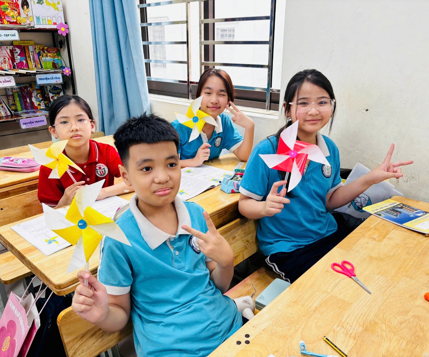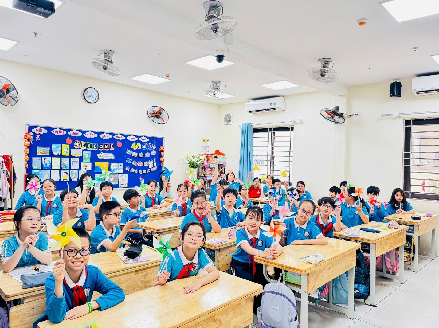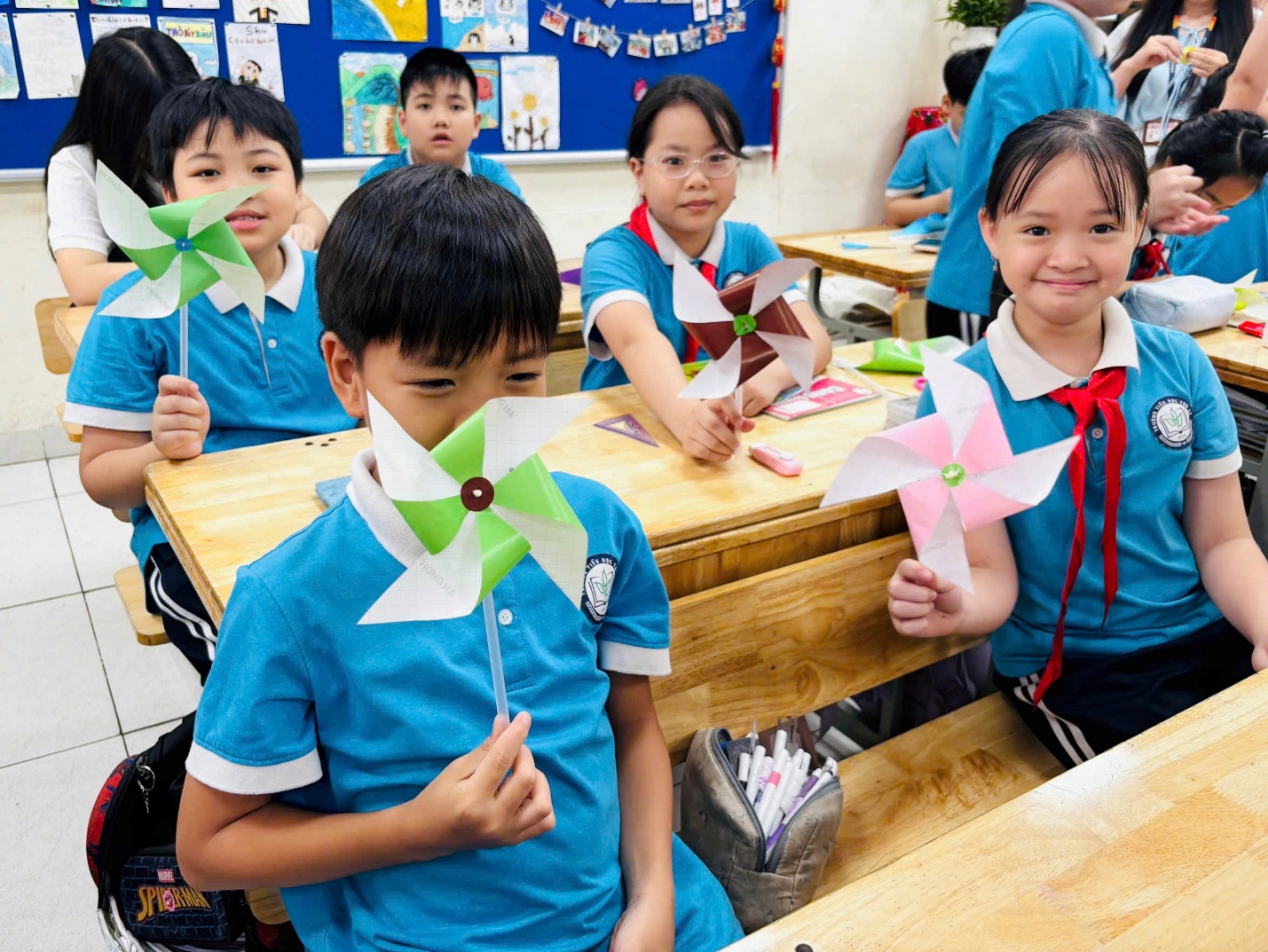 Không khí lớp học trở nên rộn ràng hơn bao giờ hết khi những chiếc chong chóng bắt đầu quay tít trong làn gió nhẹ. Trên gương mặt mỗi học sinh đều ánh lên niềm vui, sự thích thú và tự hào khi tự tay mình làm ra sản phẩm.