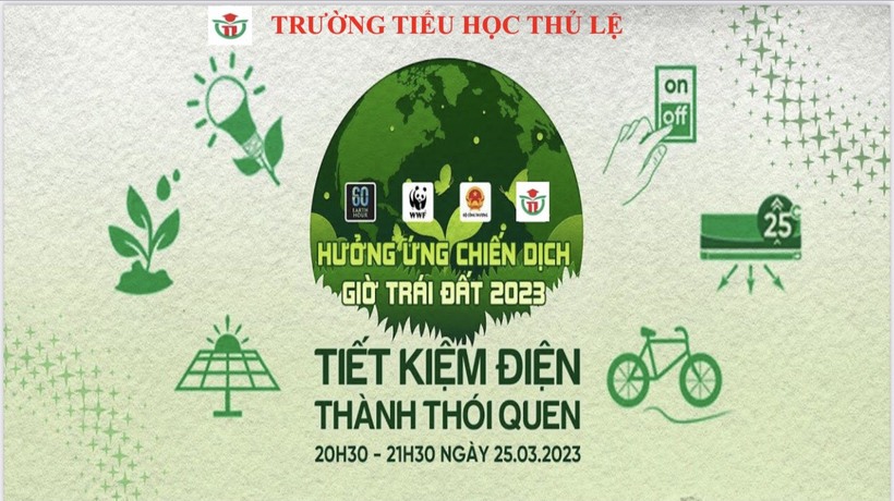 Hưởng ứng chiến dịch Giờ Trái đất năm 2023 với chủ đề “Tiết kiệm điện - thành thói quen”, tập thể cán bộ, giáo viên, nhân viên và các em học sinh trường Tiểu học Thủ Lệ cùng hưởng ứng tham gia vào hoạt động này. Hãy tắt các thiết bị điện tử, đèn chiếu sáng và các thiết bị không cần thiết khác trong khoảng thời gian từ 20h30 đến 21h30 để thể hiện sự quan tâm của chúng ta đến môi trường và hành động để bảo vệ trái đất của chúng ta.