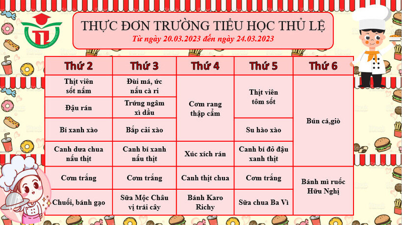 Nhà trường gửi tới các bậc PH và các con HS thực đơn tuần 4 tháng 3/2023. Trân trọng!