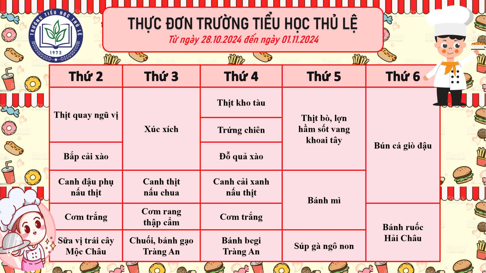 Nhà trường gửi tới các bậc PH và các con HS thực đơn tuần 5 tháng 10/2024. Trân trọng!
