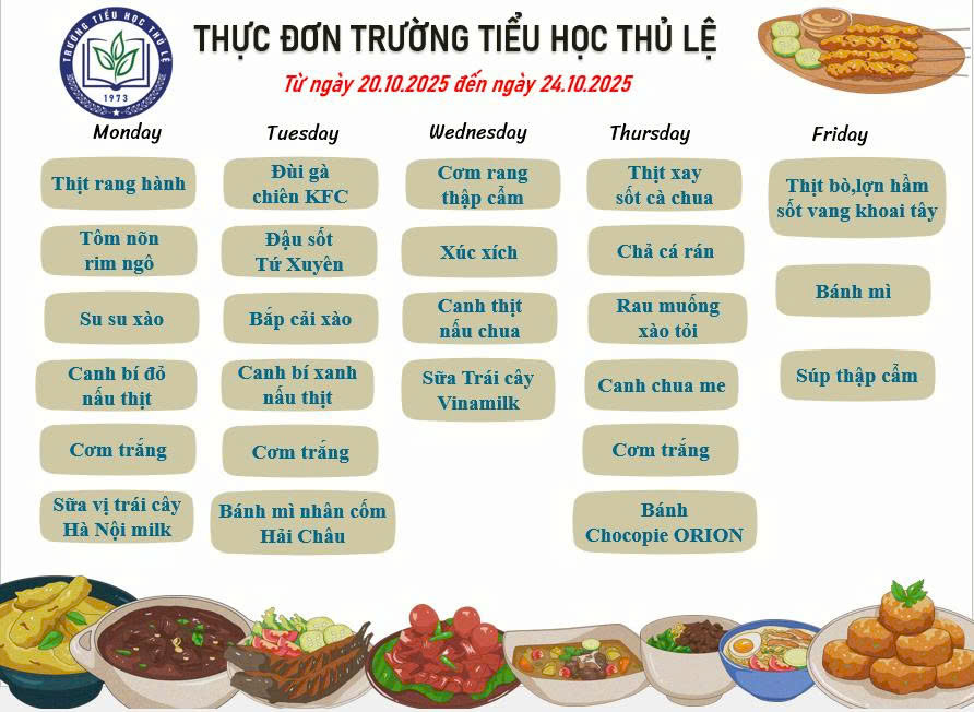 Nhà trường gửi tới các bậc PH và các con HS thực đơn tuần 4 tháng 10/2025. Trân trọng!
