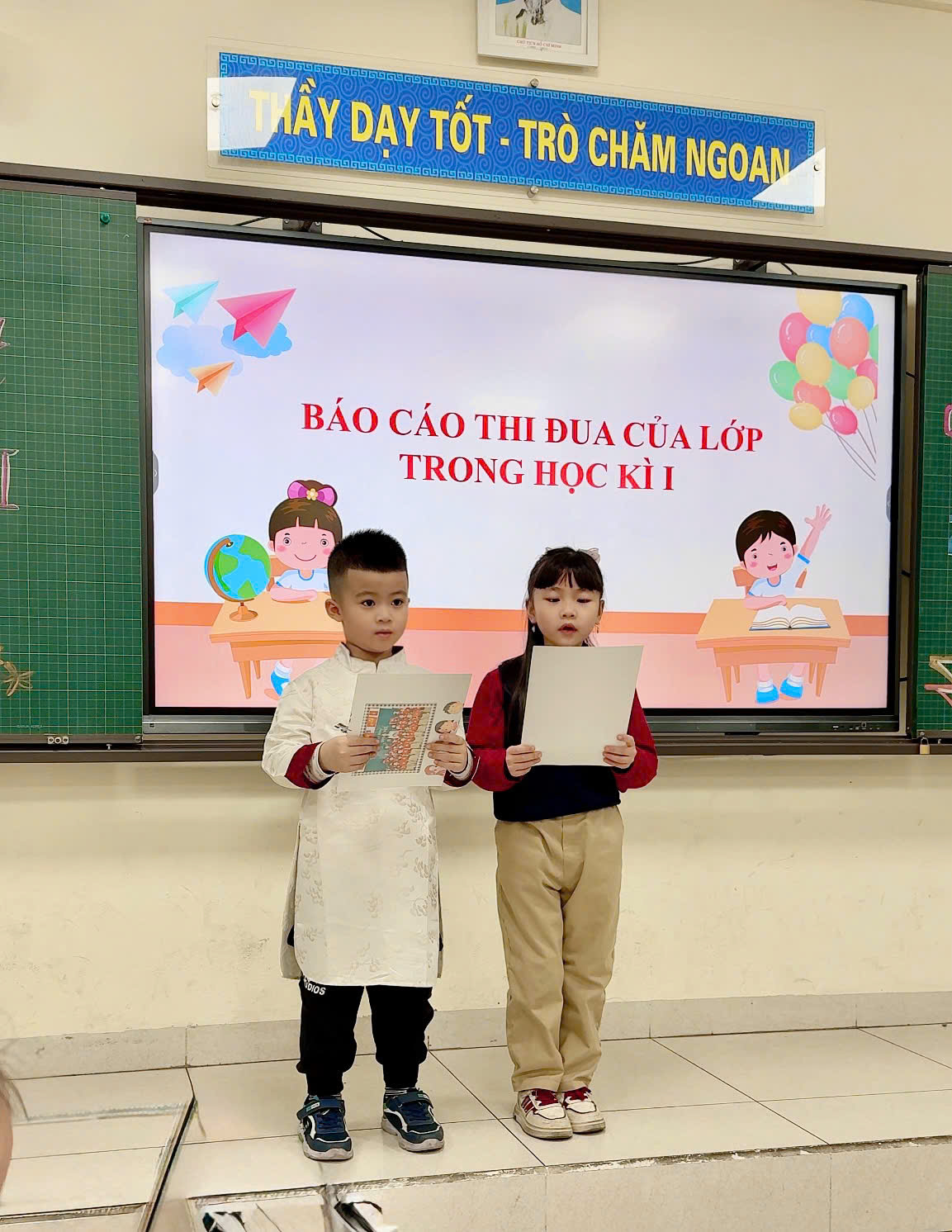 Mở đầu buổi họp là phần dẫn chương trình vô cùng tự tin, đáng yêu của các con học sinh lớp 1C. Những giọng nói non nớt, ánh mắt trong veo nhưng đầy cố gắng đã khiến cả khán phòng rộn ràng tiếng vỗ tay và những nụ cười hạnh phúc.