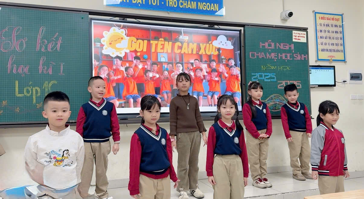 Khoảnh khắc lắng đọng nhất có lẽ là khi video tổng kết các hoạt động học tập – trải nghiệm của học sinh trong học kì I được trình chiếu. Từng hình ảnh quen thuộc hiện lên: những ngày đầu bỡ ngỡ vào lớp 1, những giờ học chăm chú, những nụ cười hồn nhiên trong các hoạt động trải nghiệm… Tất cả đã tạo nên một chặng đường đầu tiên thật đáng nhớ trong hành trình trưởng thành của các con.