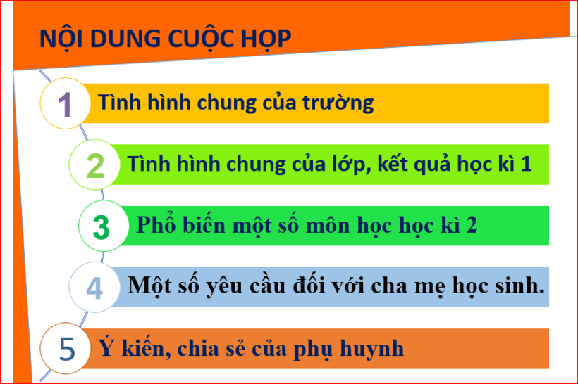 Nội dung chính của buổi họp được các phụ huynh mong chờ nhất là phần chia sẻ của giáo viên chủ nhiệm về các mặt hoạt động của lớp. Các bậc phụ huynh chăm chú lắng nghe nhận xét của giáo viên chủ nhiệm về tình hình của lớp cũng như từng học sinh.