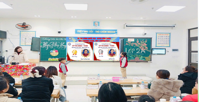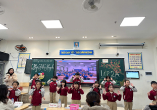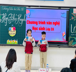(Học sinh lớp 2A biểu diễn các tiết mục văn nghệ chào mừng các bậc PHHS tới họp)