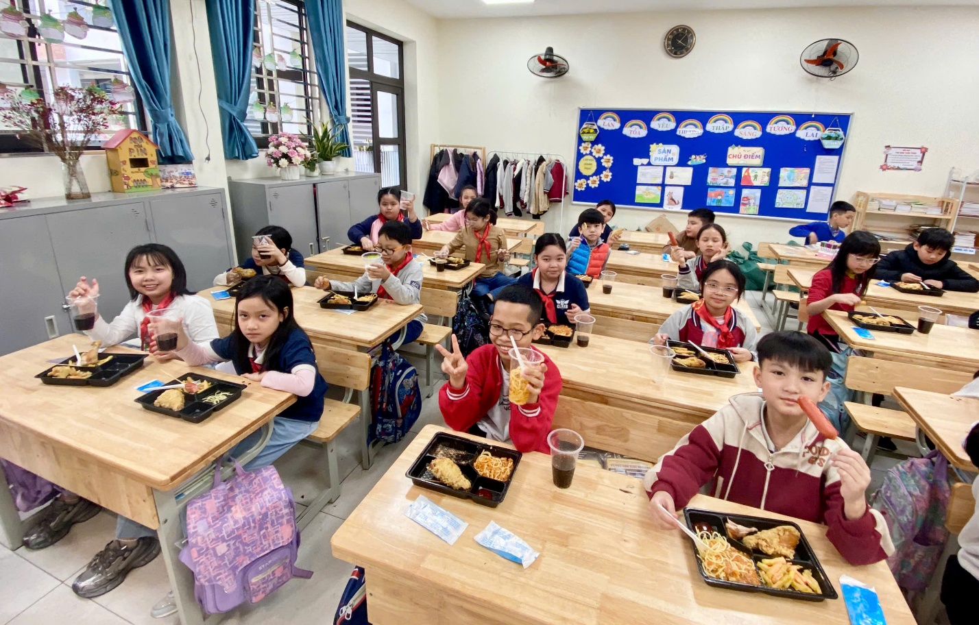 Sau phần khen thưởng, lớp 4B cùng nhau liên hoan với các món khoái khẩu do bếp ăn nhà trường chuẩn bị chu đáo, đảm bảo vệ sinh an toàn thực phẩm. Những nụ cười rạng rỡ, những khoảnh khắc quây quần thân tình đã khép lại buổi sơ kết bằng một cảm xúc thật trọn vẹn.