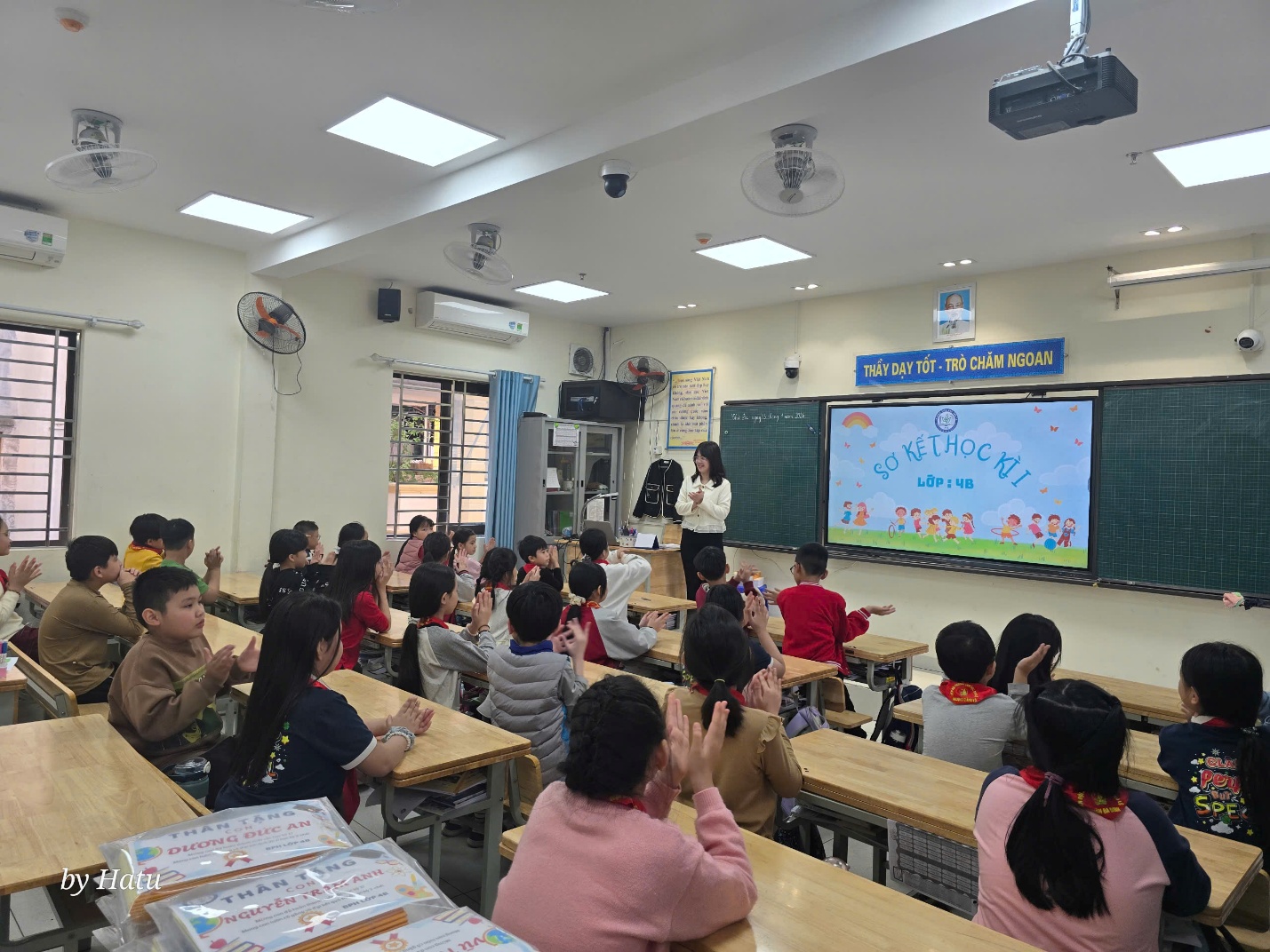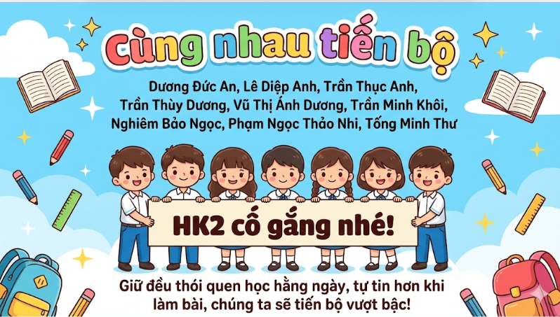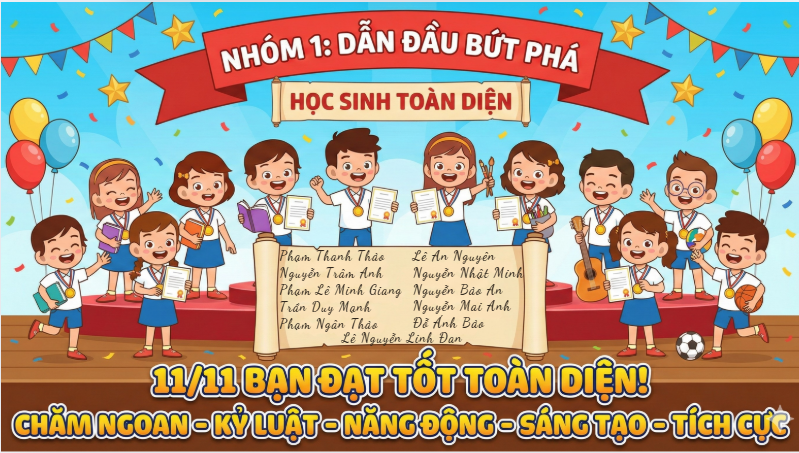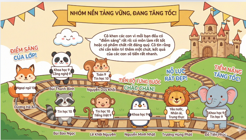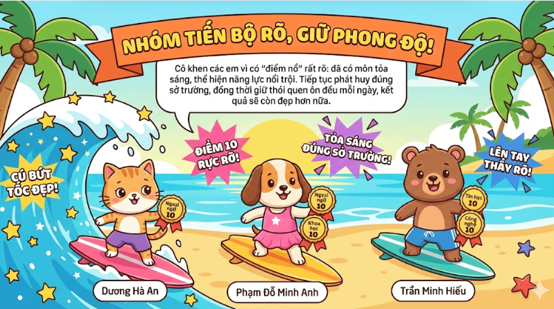 Tại buổi sơ kết, các con được tổng hợp kết quả học tập, nề nếp và tinh thần tham gia các hoạt động của lớp. Nhiều bạn có tiến bộ rõ rệt trong ý thức tự giác, sự mạnh dạn khi phát biểu, tinh thần hợp tác trong học nhóm và thái độ tích cực trong các giờ học. Cô giáo chủ nhiệm đã sử dụng AI để tạo ra những hình ảnh nhận xét về các nhóm học sinh vừa đẹp mắt, vừa ý nghĩa. Đó cũng là món quà nhỏ, lời động viên của cô dành cho các con học sinh yêu quý.