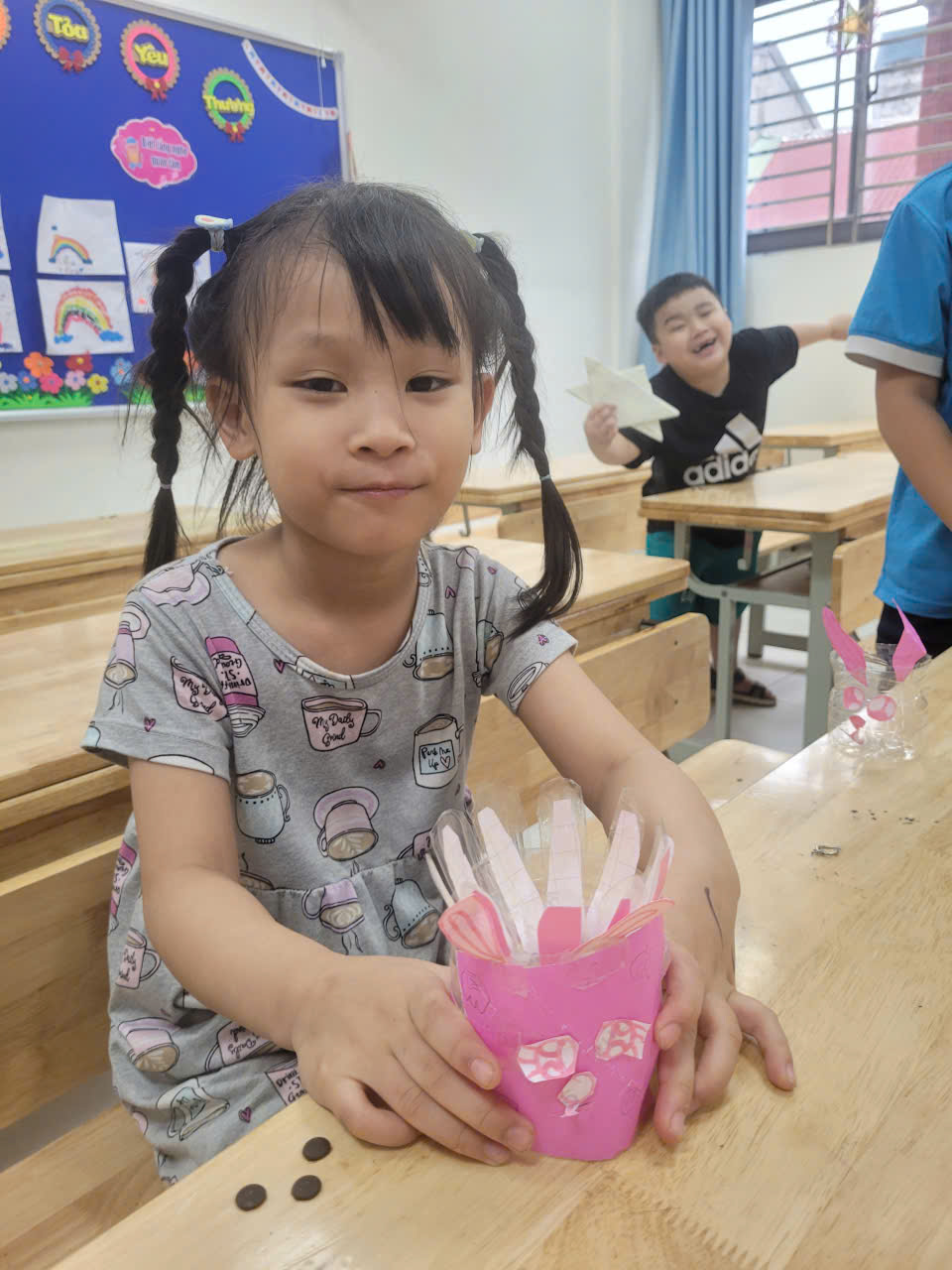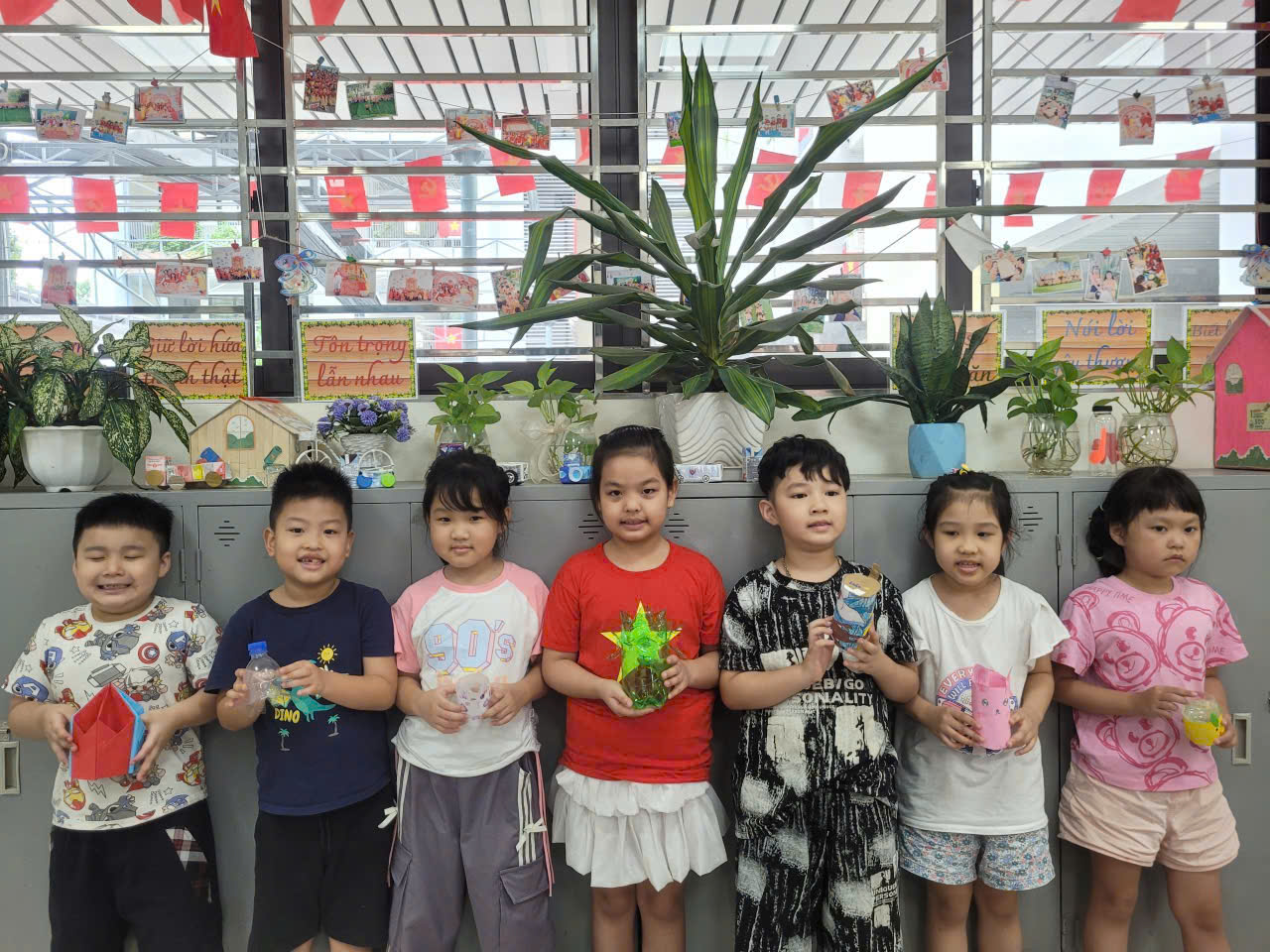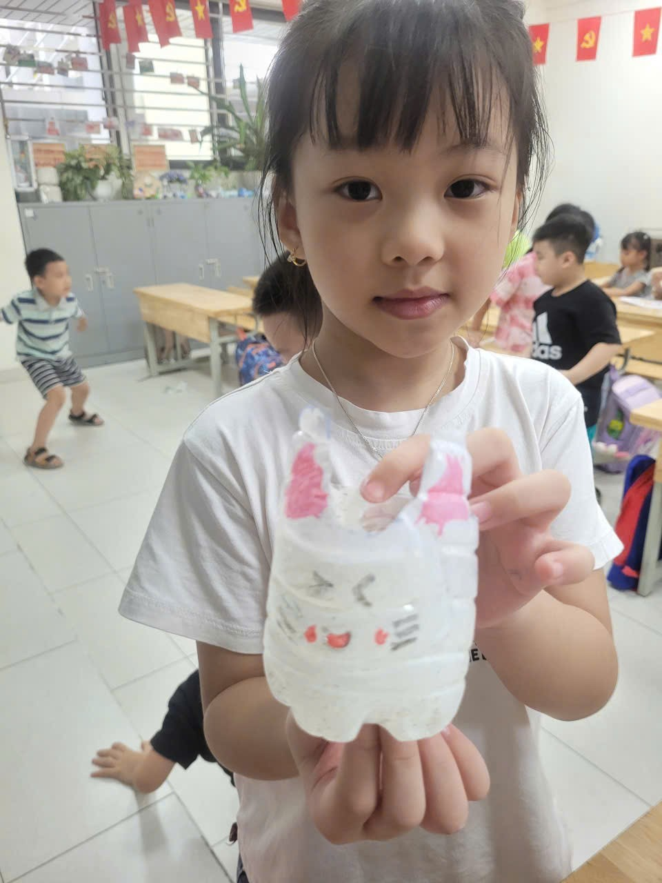 Với sự hướng dẫn của cô giáo , các em đã sáng tạo ra những hộp bút độc đáo từ bìa carton, lon thiếc cũ và các vật dụng quen thuộc. Không dừng lại ở đó, các em còn biết tái chế chai nhựa thành chậu trồng cây, góp phần lan tỏa thông điệp "biến rác thành vàng", bảo vệ môi trường sống xung quanh.