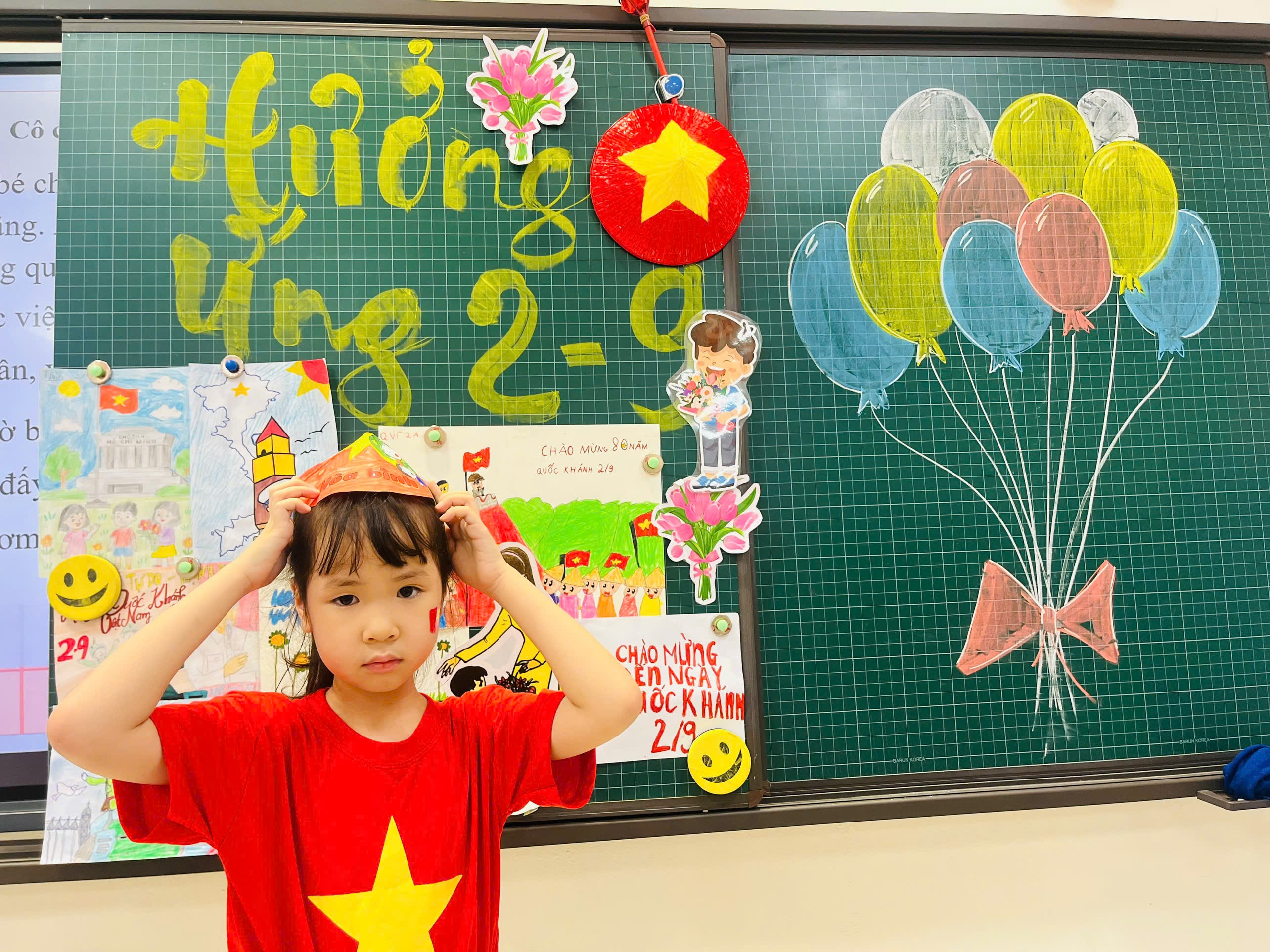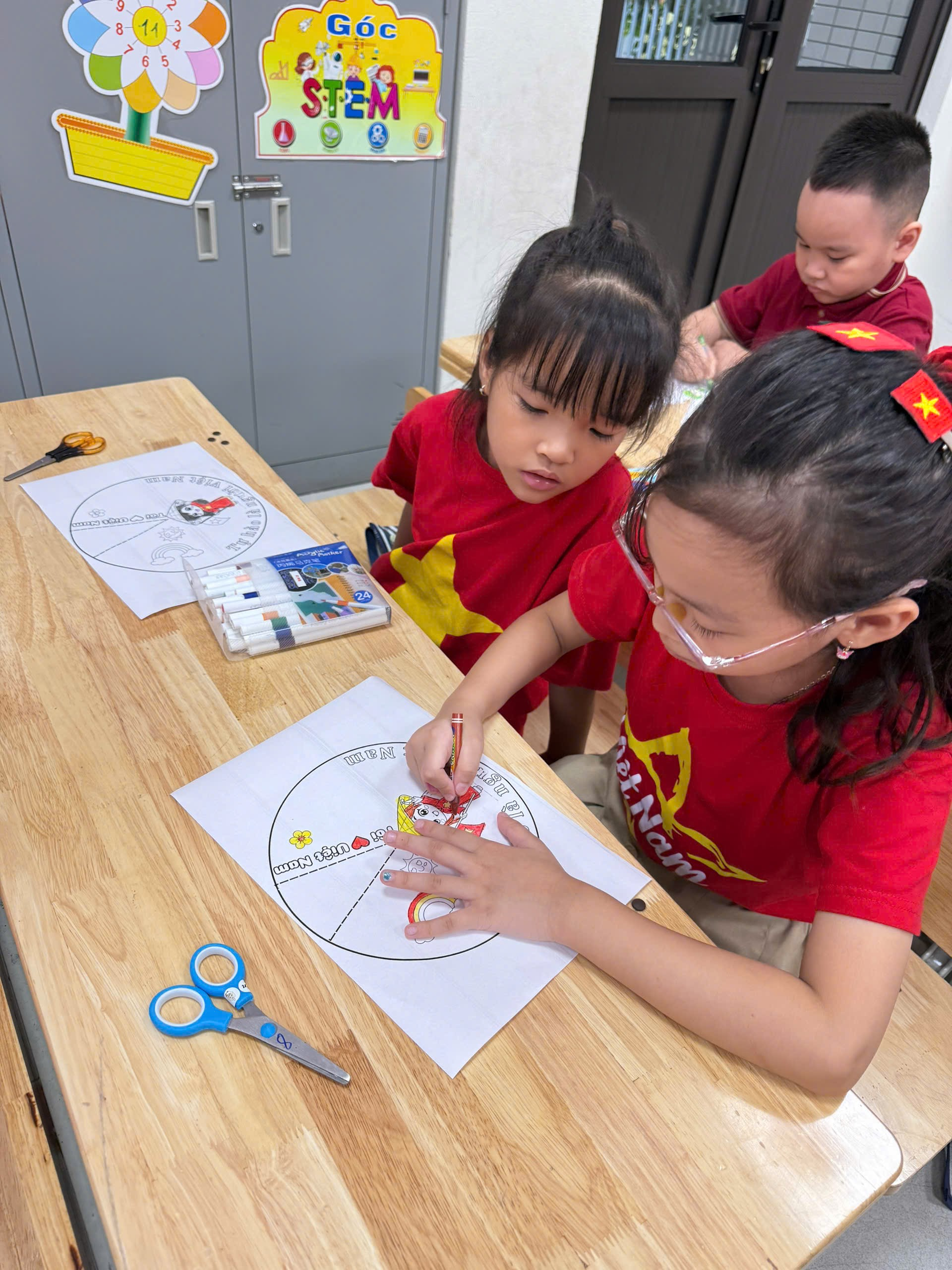 Không chỉ dừng ở nghệ thuật, các em còn tham gia hoạt động thủ công kết hợp STEM. Dưới sự hướng dẫn của cô giáo, lớp 2A đã có một buổi trải nghiệm đặc biệt: làm nón trang trí chào mừng Quốc khánh. Từng tờ giấy màu, từng nét cắt dán tỉ mỉ đã trở thành những chiếc nón rực rỡ, mang hình ảnh lá cờ đỏ sao vàng, hoa sen hay dòng chữ “2/9 – Tự hào Việt Nam”.