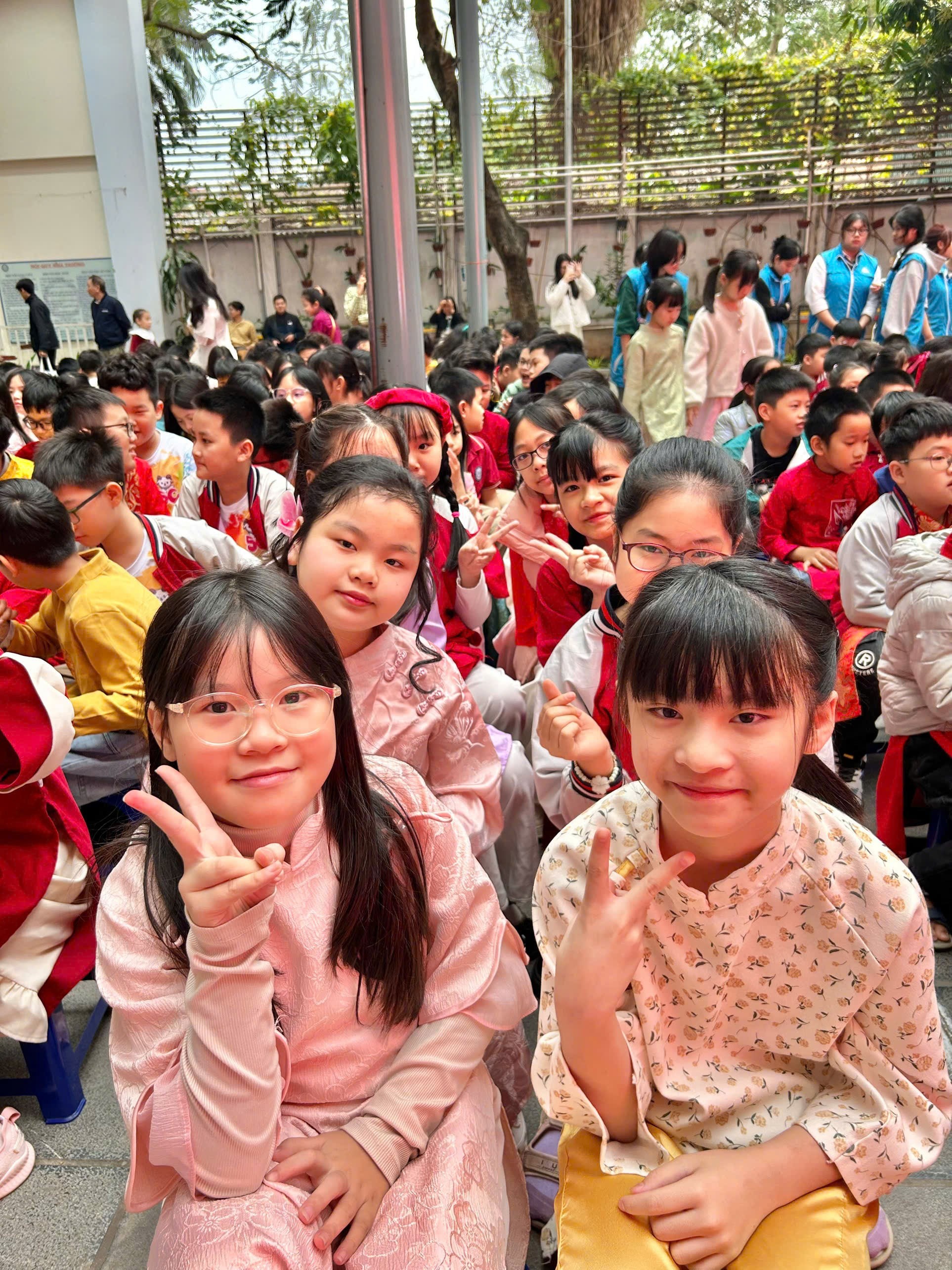 Ngay từ đầu giờ, lớp 5D đã có mặt đông đủ, đúng giờ. Bạn nào cũng gọn gàng trong tà áo dài hoặc trang phục truyền thống nhiều màu sắc. Cả lớp cùng nhau chụp ảnh trước phông nền lễ hội, lưu lại những khoảnh khắc đáng nhớ. Những nụ cười tươi rói, những ánh mắt háo hức khiến bức ảnh nào cũng tràn đầy sức sống. Nhìn các con ríu rít gọi nhau, chỉnh lại khăn áo cho bạn, ai cũng cảm nhận rõ tinh thần “mỗi ngày đến trường là một ngày vui”.