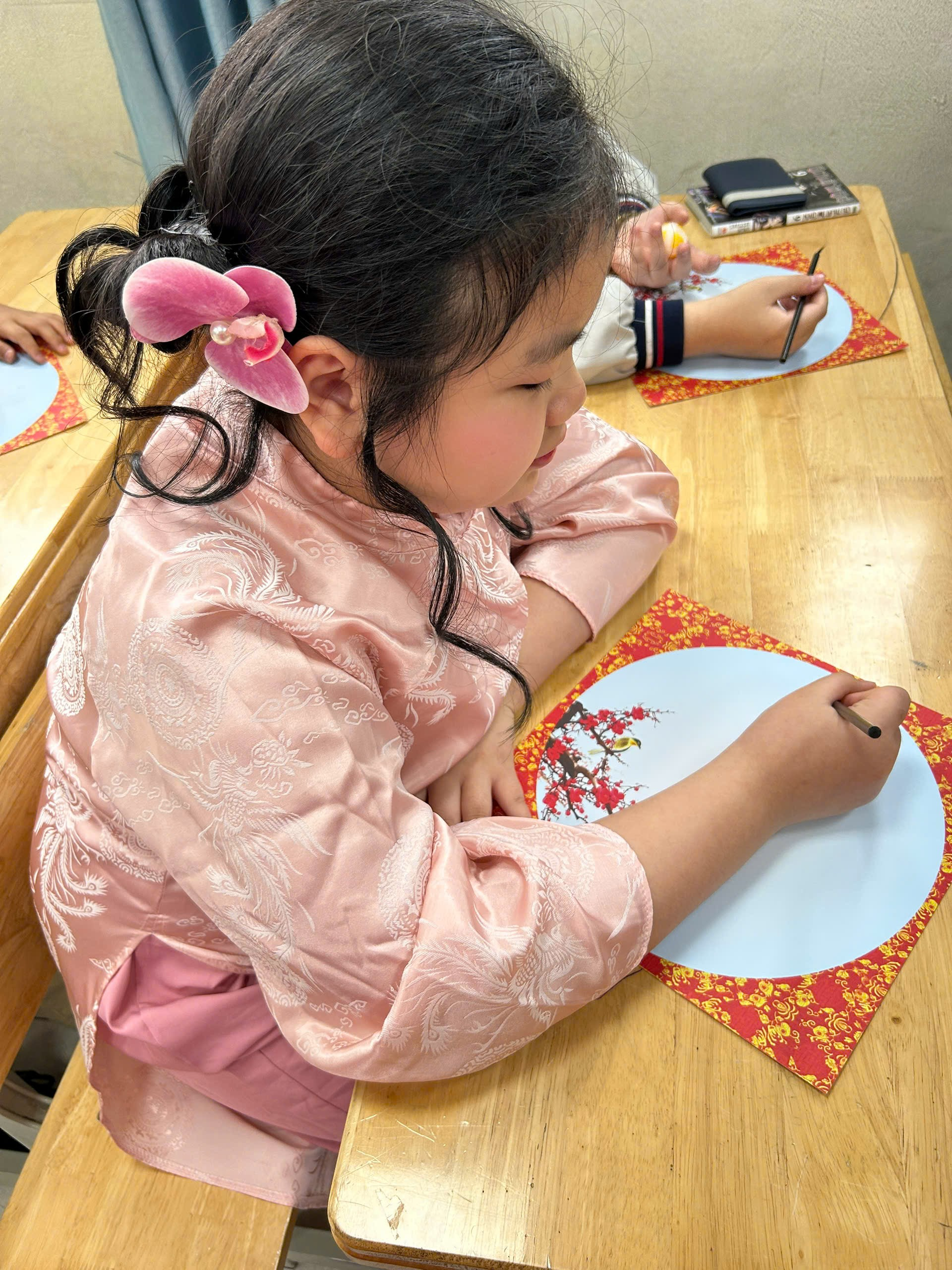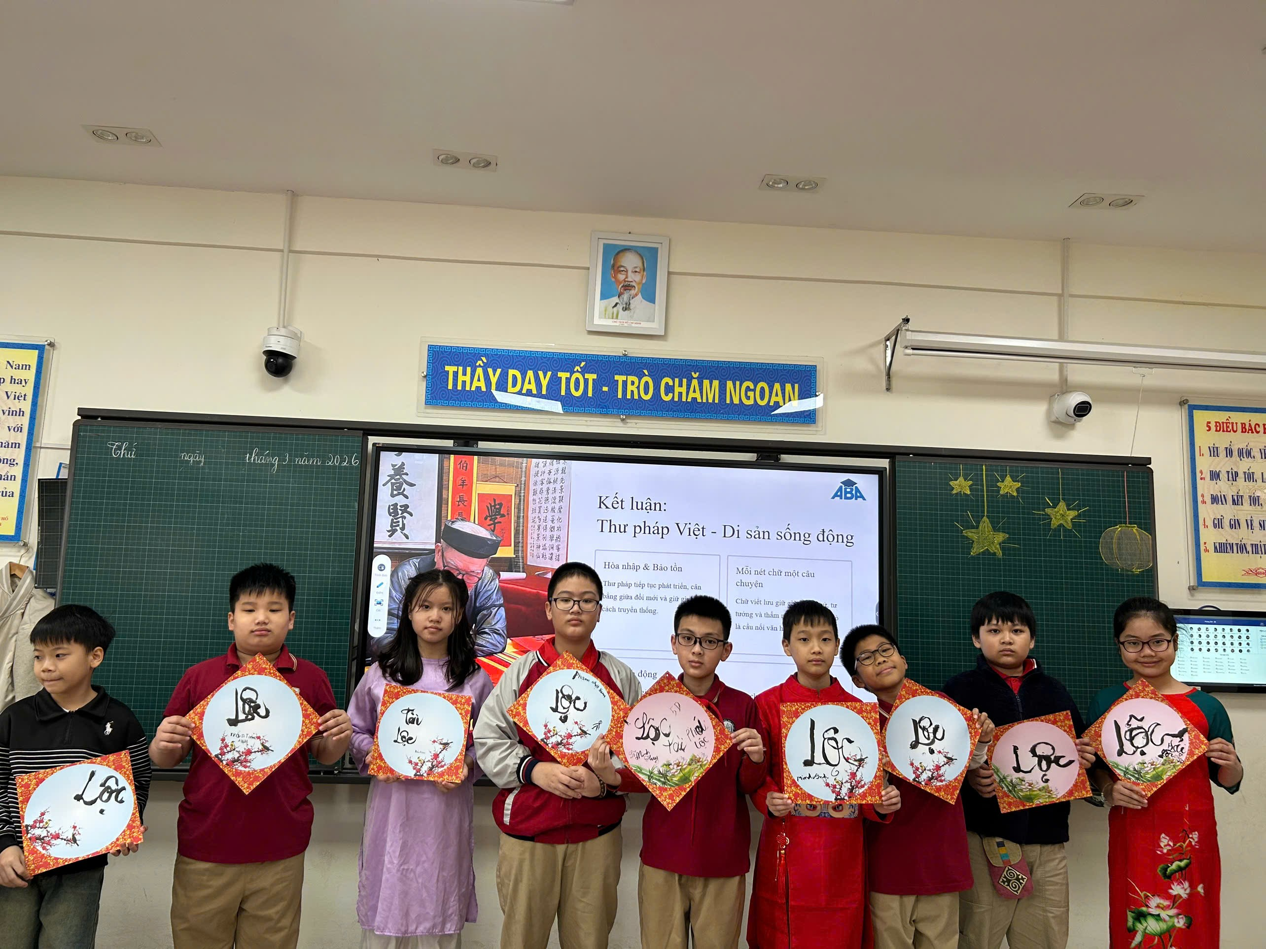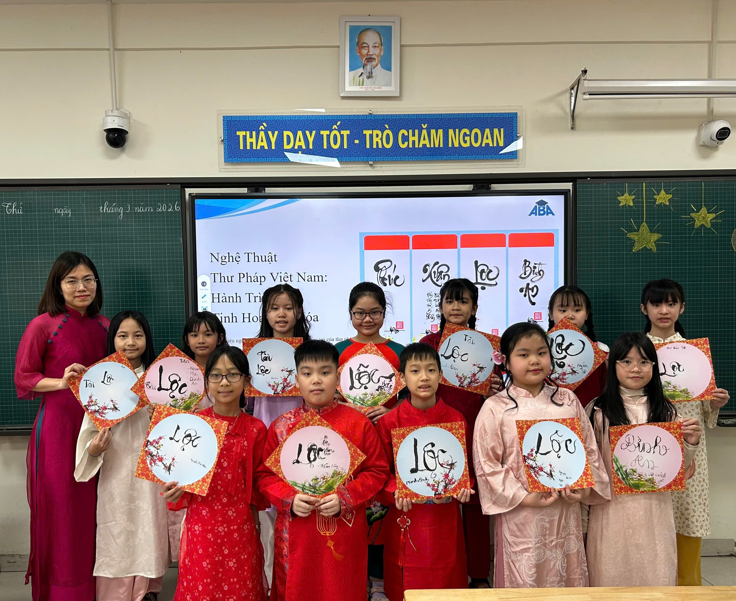 Sau phần khai mạc và văn nghệ chào mừng, các con trở về lớp để tìm hiểu và thực hành viết thư pháp. Đây là hoạt động nhẹ nhàng nhưng rất ý nghĩa. Các bạn được nghe giới thiệu về nét đẹp của chữ Việt ngày xuân, rồi tự tay viết những chữ mang ý nghĩa tốt lành như “Lộc”, “Bình an”, “Phúc”. Có bạn còn cẩn thận trang trí thêm cho tờ giấy của mình. Mỗi tấm chữ nhỏ xinh là một lời chúc đầu năm, là cách các con gìn giữ truyền thống theo cách rất hồn nhiên và gần gũi.