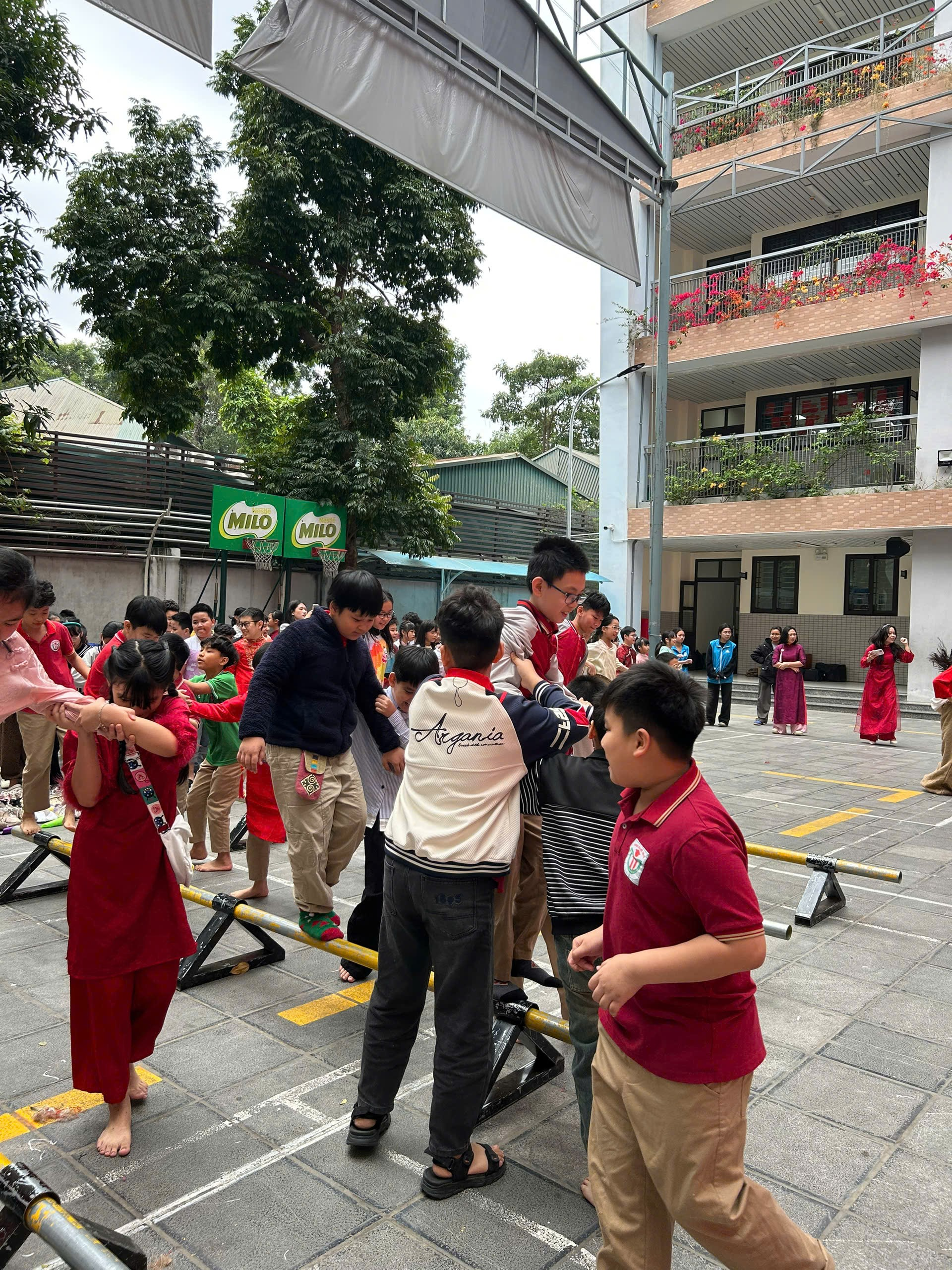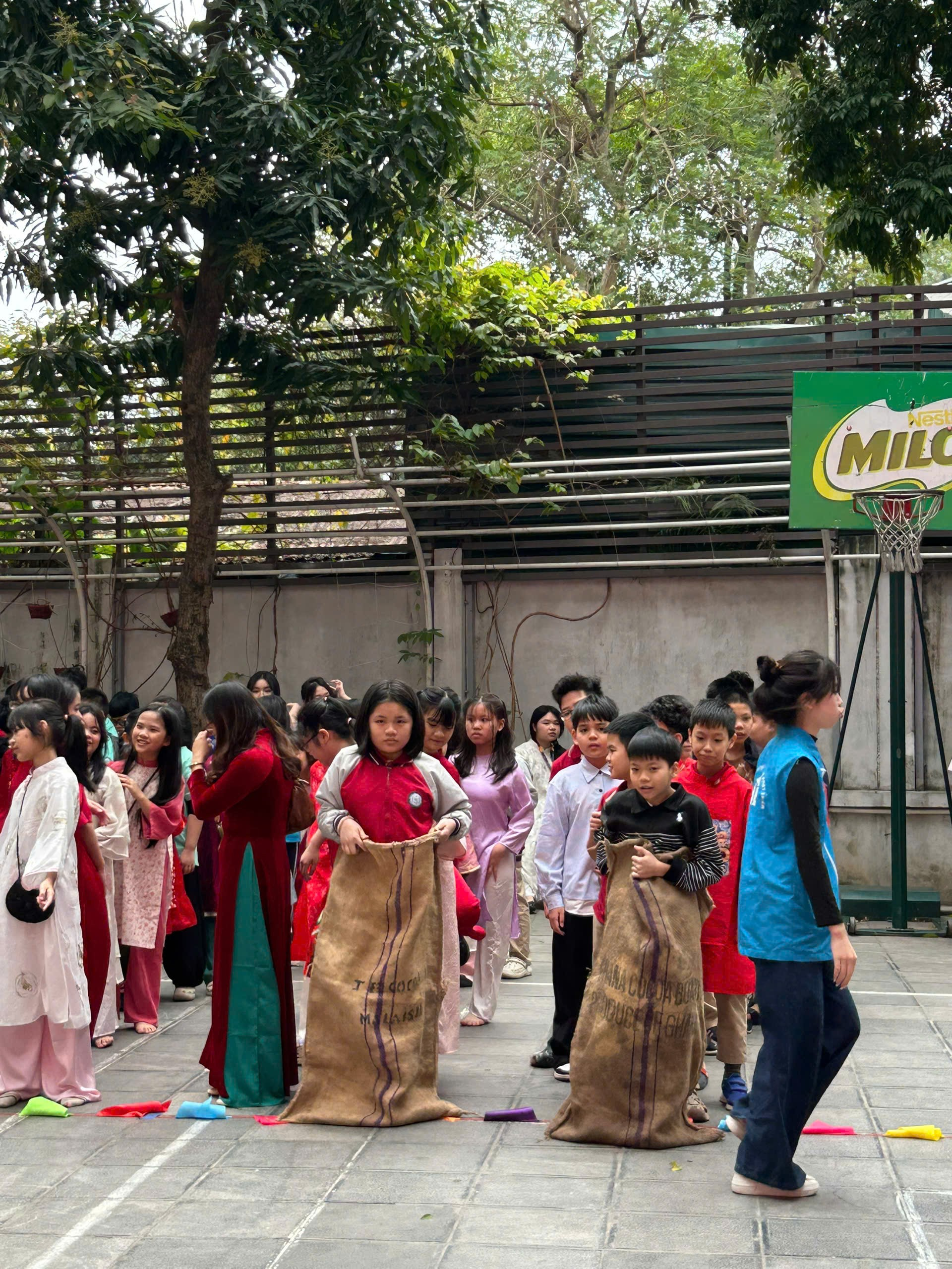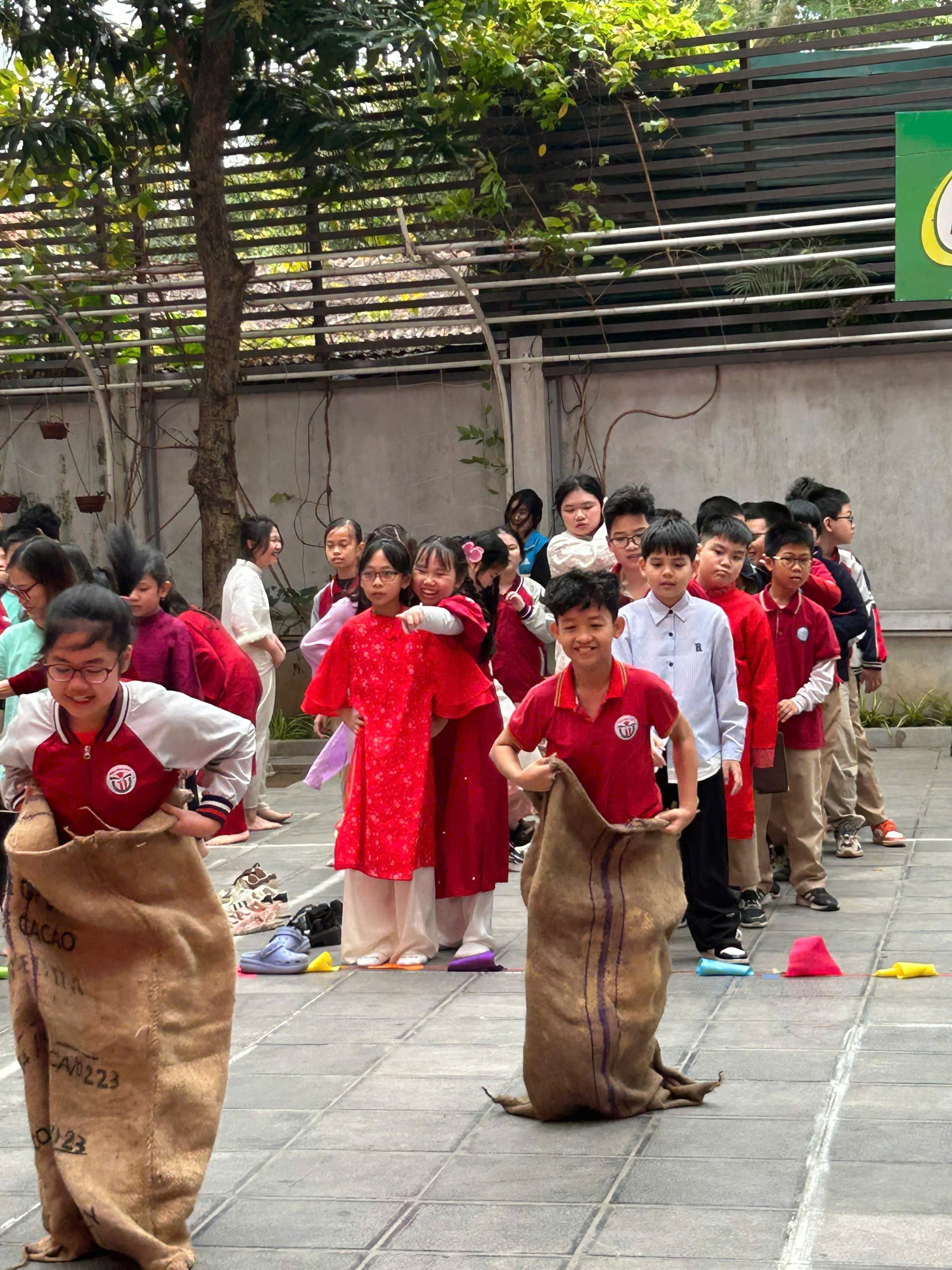 Nhảy bao bố là phần thi khiến cả lớp hào hứng nhất. Những bước nhảy bật lên liên tục, có lúc loạng choạng rồi lại bật cười. Tiếng hò reo cổ vũ vang dội khắp sân trường. Các con không chỉ thi đua để về đích nhanh mà còn học cách phối hợp, động viên và chờ đợi nhau.