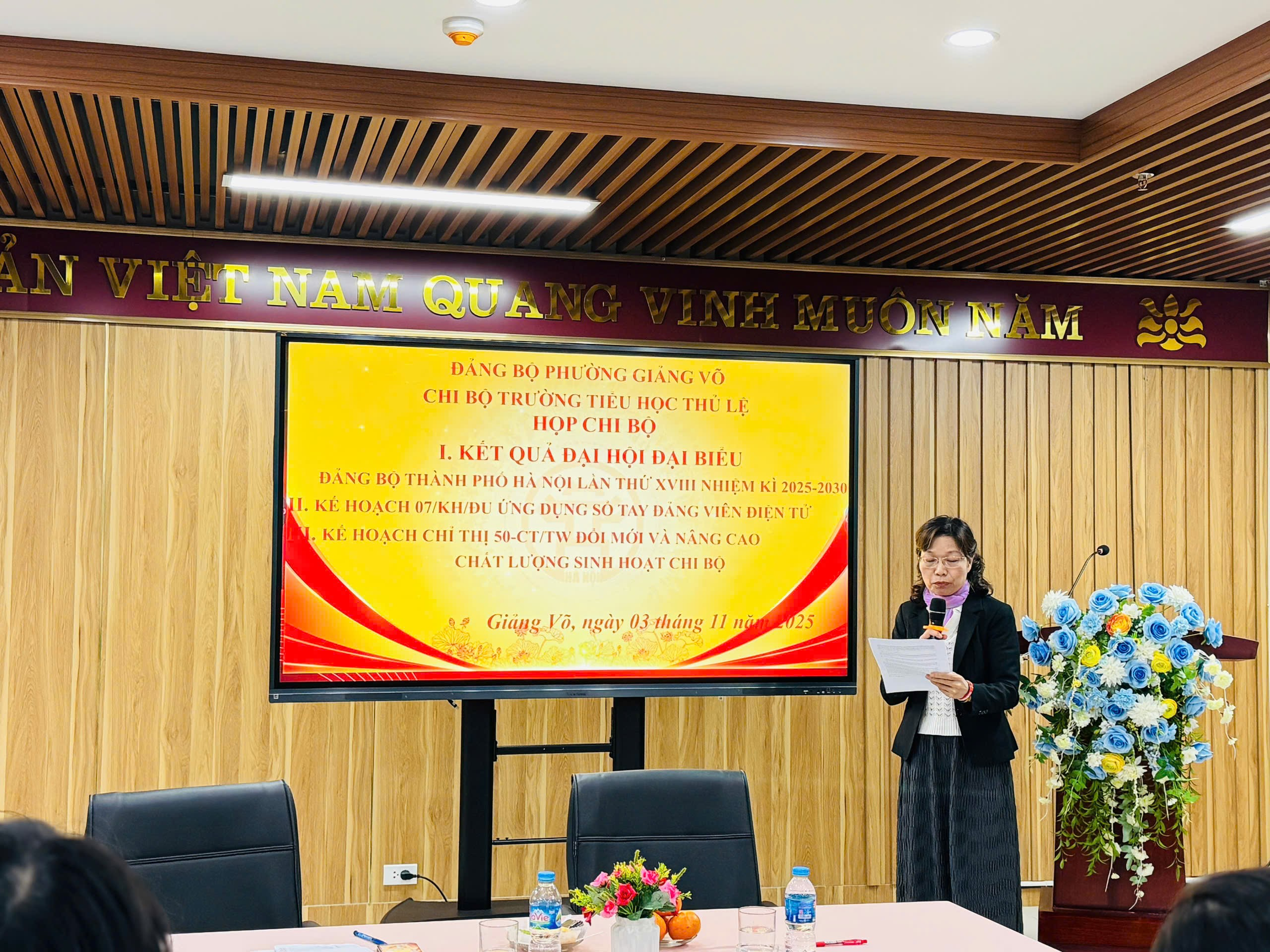 Chiều ngày 3 tháng 11 năm 2025, Chi bộ Trường Tiểu học Thủ Lệ đã tổ chức buổi sinh hoạt chi bộ thường kỳ tháng 11 với sự chủ trì của đồng chí Nguyễn Ngọc Anh - Phó Bí thư Chi bộ, phó Hiệu trưởng nhà trường cùng sự tham dự đầy đủ của các đảng viên trong Chi bộ. Về dự buổi sinh hoạt còn có đồng chí đại biểu Trần Thị Tố Tâm - Ủy viên Thường vụ, Chủ tịch Ủy ban MTTQ phường Giảng Võ. Buổi sinh hoạt đã diễn ra trong không khí dân chủ, nghiêm túc, đoàn kết và trách nhiệm.