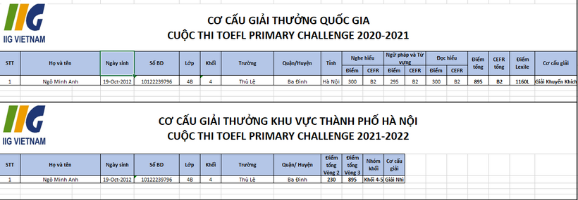 Thật vinh dự cho trường Tiểu học Thủ Lệ có học sinh Ngô Minh Anh học sinh lớp 5B đã đạt giải Khuyến Khích cấp Quốc gia và đạt giải Nhì cấp Thành phố cuộc thi TOEEL PRIMARY CHALLENGE 2021-2022.