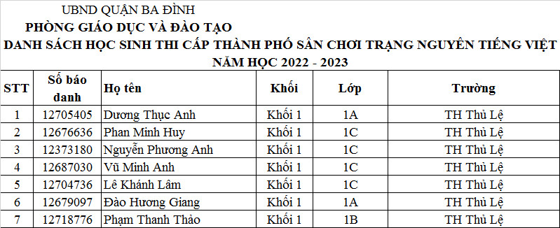 Ban tổ chức cuộc thi Trạng nguyên Tiếng Việt Trường Tiểu học Thủ Lệ trân trọng thông báo danh sách học sinh thi cấp Thành phố Trạng Nguyên Tiếng Việt khối 1: